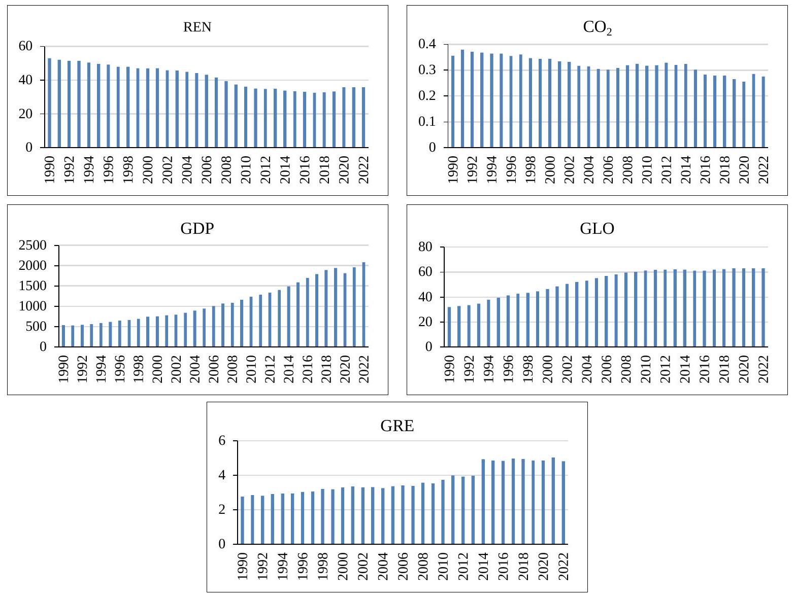 The descriptive statistics in connection with all interested indicators are illustrated in Table 2. The summary snapshot suggests that the average value of GDP is highest, while the value of is negative. This is accompanied by REN ( 0.930453 ), GLO ( 0.984221 ), and GRE ( 0.324401 ). The standard deviation of economic growth is the highest, while is less volatile than other time series. With the exemption of GRE and GDP, CO2, REN, and GLO are negatively skewed. Additionally, the selected indicators have positive kurtosis, and their coefficients are less than 3 . Also, the Jarque-Bera value reveals that all-time series under investigation conform to normality at the significant level. The selected examination in India from 1990 to 2022 is described in Figure 2.