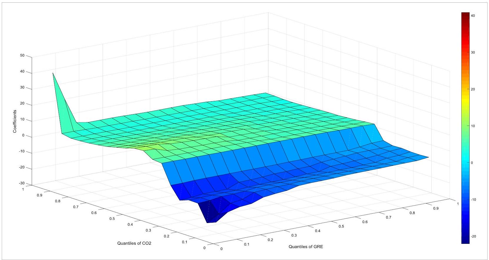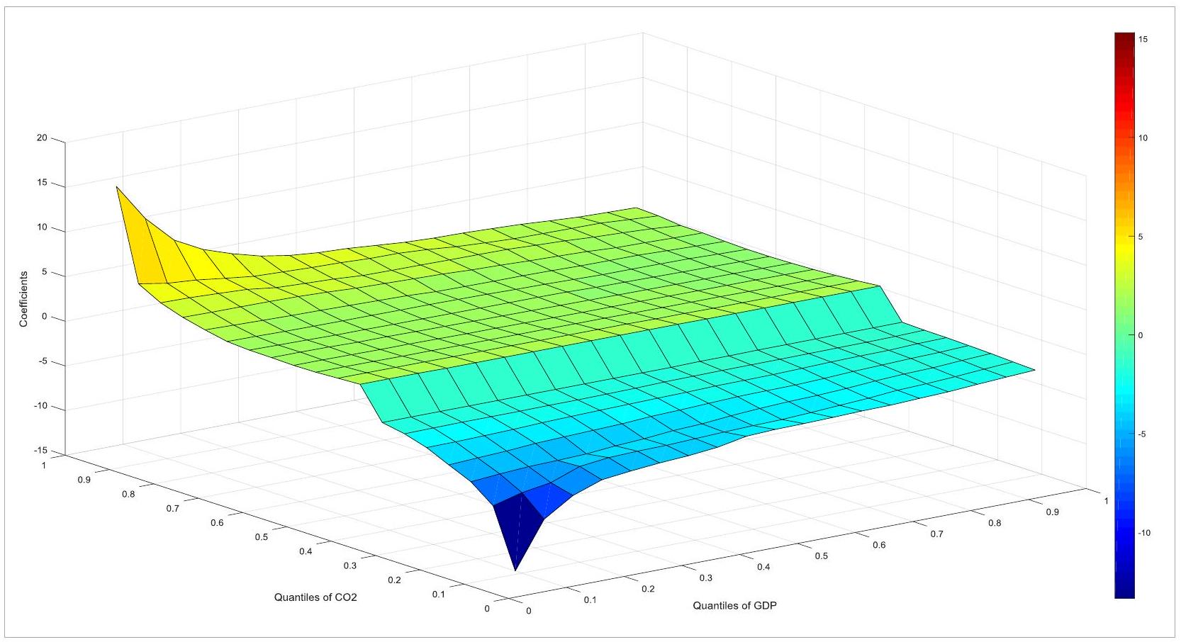 Figure 4a highlights the influence of economic growth on emissions in India. The slope coefficient spans between -15 and 20. The negative effect of GDP on CO2 emissions is found at all quantiles of GDP and lower quantiles of CO2 (0.15-0.35). In addition, the coefficient of slope is weak and positive in the medium and higher quantiles of and different quantiles of GDP. These findings reveal that both positive and negative impacts exist between GDP and CO2 emissions in India, but they are evidence of a weak relationship. More importantly, the positive nexus is observed throughout the quantiles of GDP and the majority of quantiles of emissions, so the GDP is a dramatic driver of India’s emissions. This result is consistent with previous articles such as Pachiyappan et al. [8], Mehmood et al. [24], and Khochiani & Nademi [7], which indicate that GDP is a considerable factor of emissions.