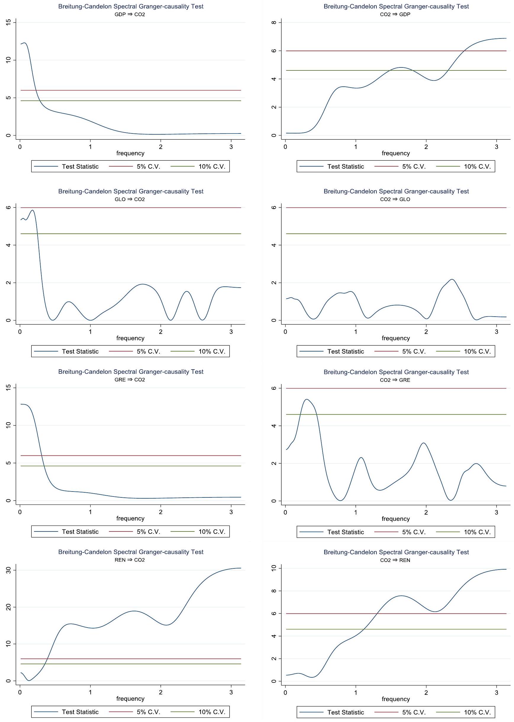 Figure 5. Spectral Granger causality between emissions and selected variables