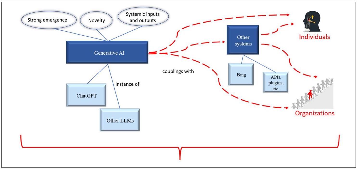 of GenAI technology within the context of other systems, organizations, individuals, and processes. Specifically, the distinct foundational properties of GenAI of strong emergence, novelty and systemic inputs and outputs, produce new challenges and opportunities for investigating the design, use and impact of this technology in organizational and societal contexts. Such investigation permits information systems users to adopt and leverage the extensive existing knowledge of organizations and systems and to integrate this knowledge with the new fundamentals of GenAI. For example, with extensive information systems research on e-commerce and personalization, the integration of GenAI in e-commerce platforms (e.g., the Bing search engine) creates opportunities to investigate: the role of generative artificial intelligence in user adoption; trust towards e-commerce technologies; and the ability to facilitate commerce and information exchange. Because of the three fundamentally new properties of GenAI (See Fig. 3), this technology can be coupled in novel ways with the broader systems. This can lead to a research opportunity to study the intersection of the technical aspects of GenAI and the ways in which these capabilities succeed or fail to support, augment, and enhance the systems they become part of, or interact with.