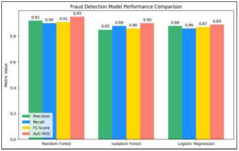 The grouped bar (Figure 4) chart compares the performance of fraud detection models such as Random Forest, Isolation Forest, and Logistic Regression across multiple metrics: Precision, Recall, F1-score, and AUC-ROC. Higher values in these metrics (closer to 1) indicate better performance. Random Forest tends to outperform Isolation Forest across most metrics, demonstrating its robustness in detecting fraudulent transactions. This visualization helps in identifying which model best balances the trade-offs between false positives and false negatives. The bar chart (Figure 5) illustrates key performance metrics for a reinforcement learning model, Deep Q-Networks(DQN), used in logistics optimization. The metrics include Total Delivery Time Reduction (%), Cost Reduction (%), and Efficiency Gains (%). A higher percentage in each category indicates better performance. For instance, a