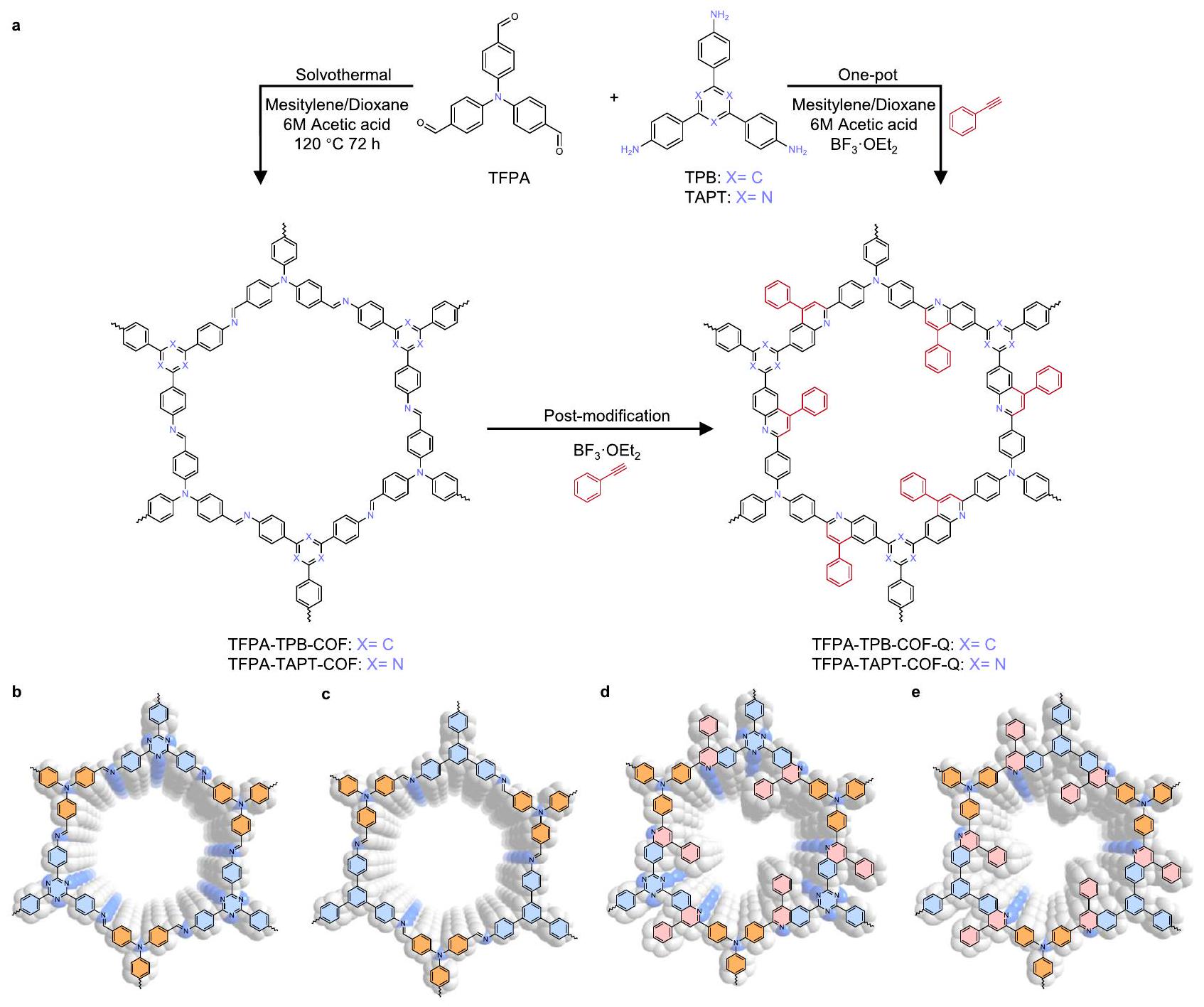 “Method” section). Therefore, TFPA-TAPT-COF-Q synthesized by the one-pot method is used for the following structural analyses and catalytic performance characterizations. Based on the structure of iminelinked TFPA-TAPT-COF, a possible quinoline-linked two-dimensional (2D) framework