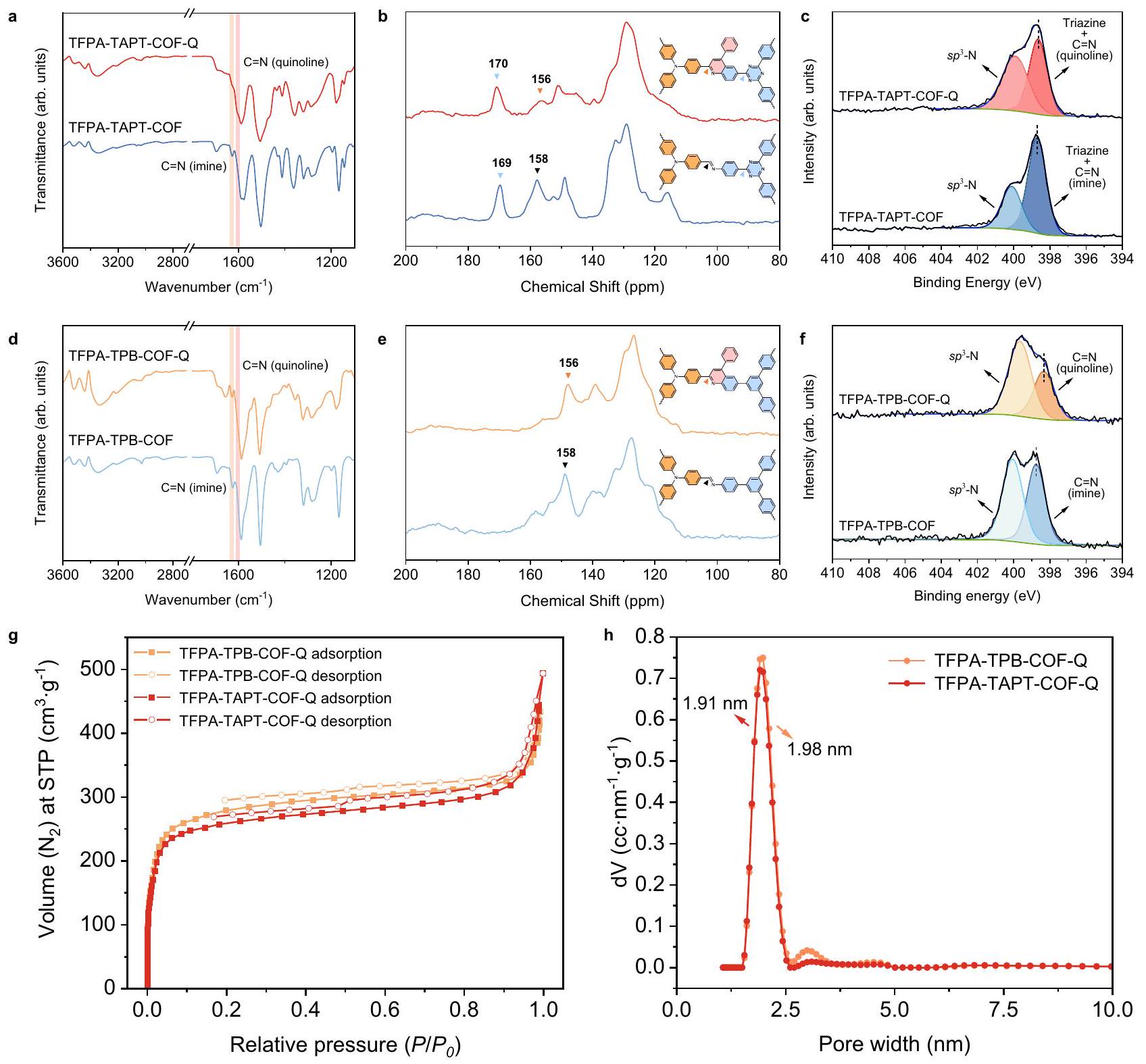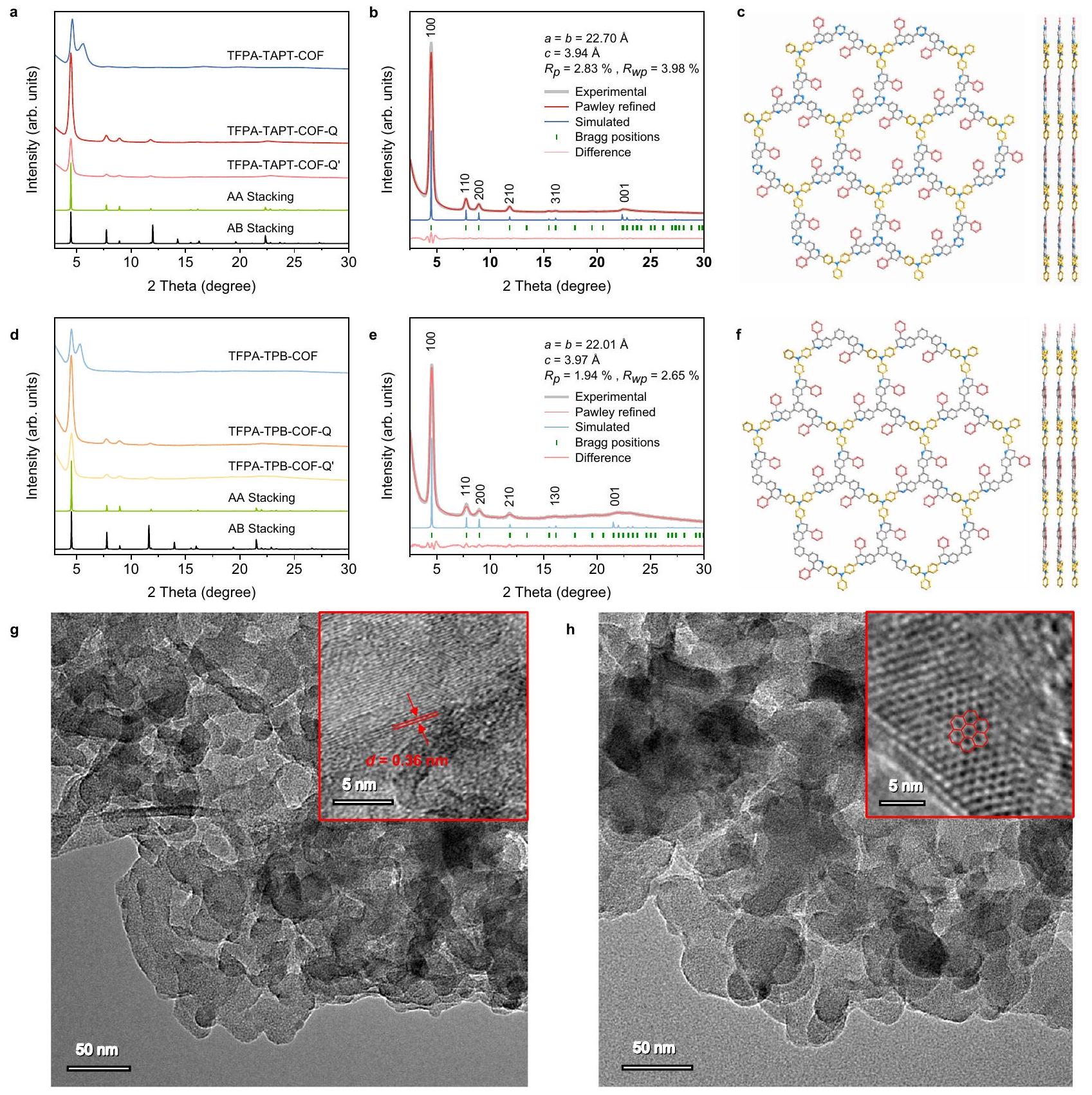 لذلك، يتم استخدام TFPA-TAPT-COF-Q الذي تم تصنيعه بطريقة الوعاء الواحد للتحليلات الهيكلية التالية وتوصيف الأداء التحفيزي. استنادًا إلى هيكل TFPA-TAPT-COF المرتبط بالإيمين، فإن إطارًا ثنائي الأبعاد (2D) مرتبطًا بالكينولين ممكن.