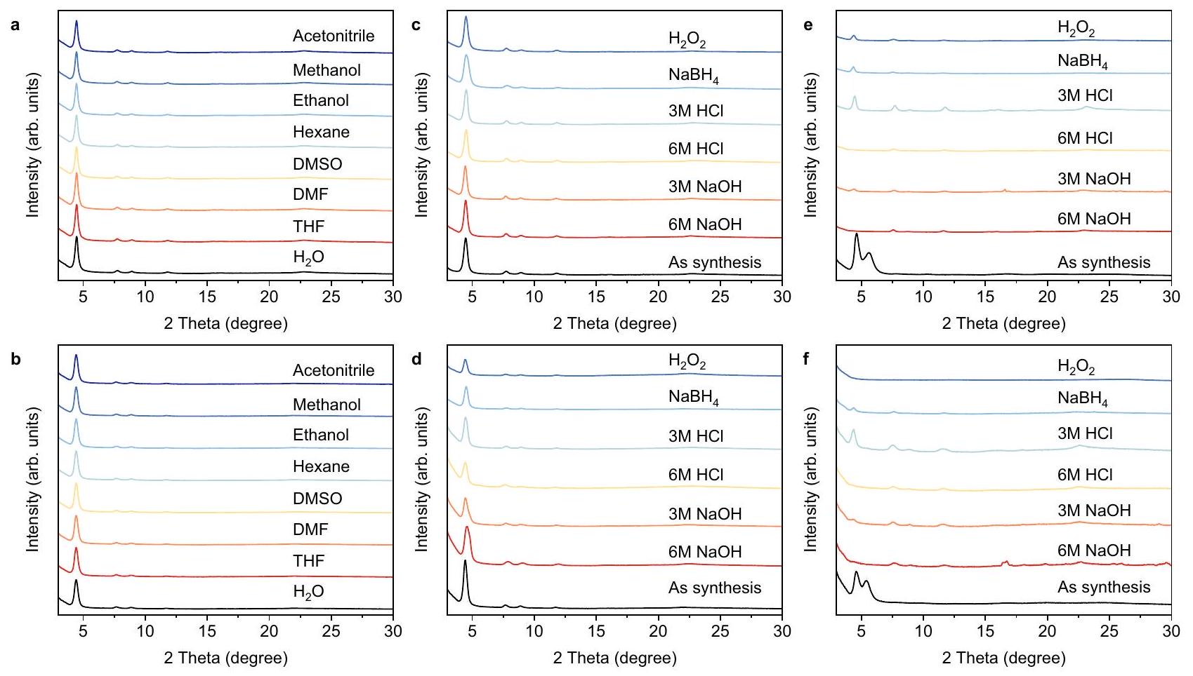 أنماط COFs المرتبطة بالإيمين بعد الغمر في محاليل الكحول التي تحتوي على عوامل مؤكسدة وعوامل مختزلة (الشكل 4e، f). كشفت التحقيقات في الاستقرار أنه بعد تحويل الروابط الإيمينية إلى روابط كينولين، يمكن لـ TFPA-TAPT-COF-Q و TFPA-TPB-COF-Q الحفاظ على استقرارها الكيميائي بشكل جيد في المحاليل الحمضية والقاعدية القاسية، وكذلك في محاليل العوامل المؤكسدة والمختزلة.