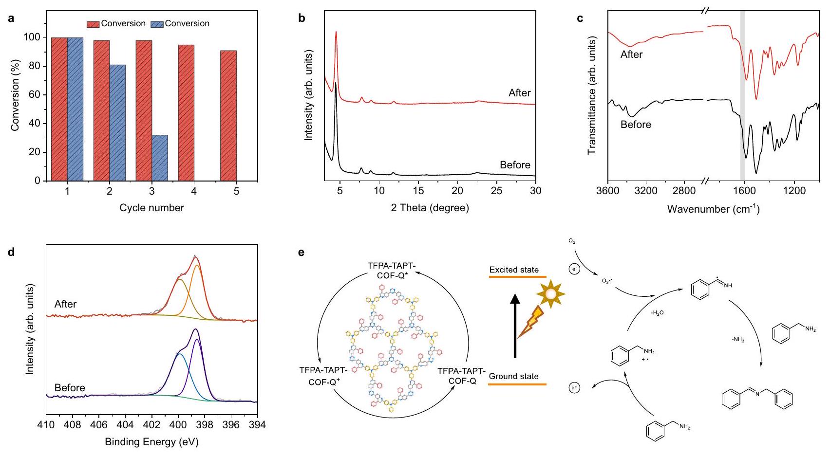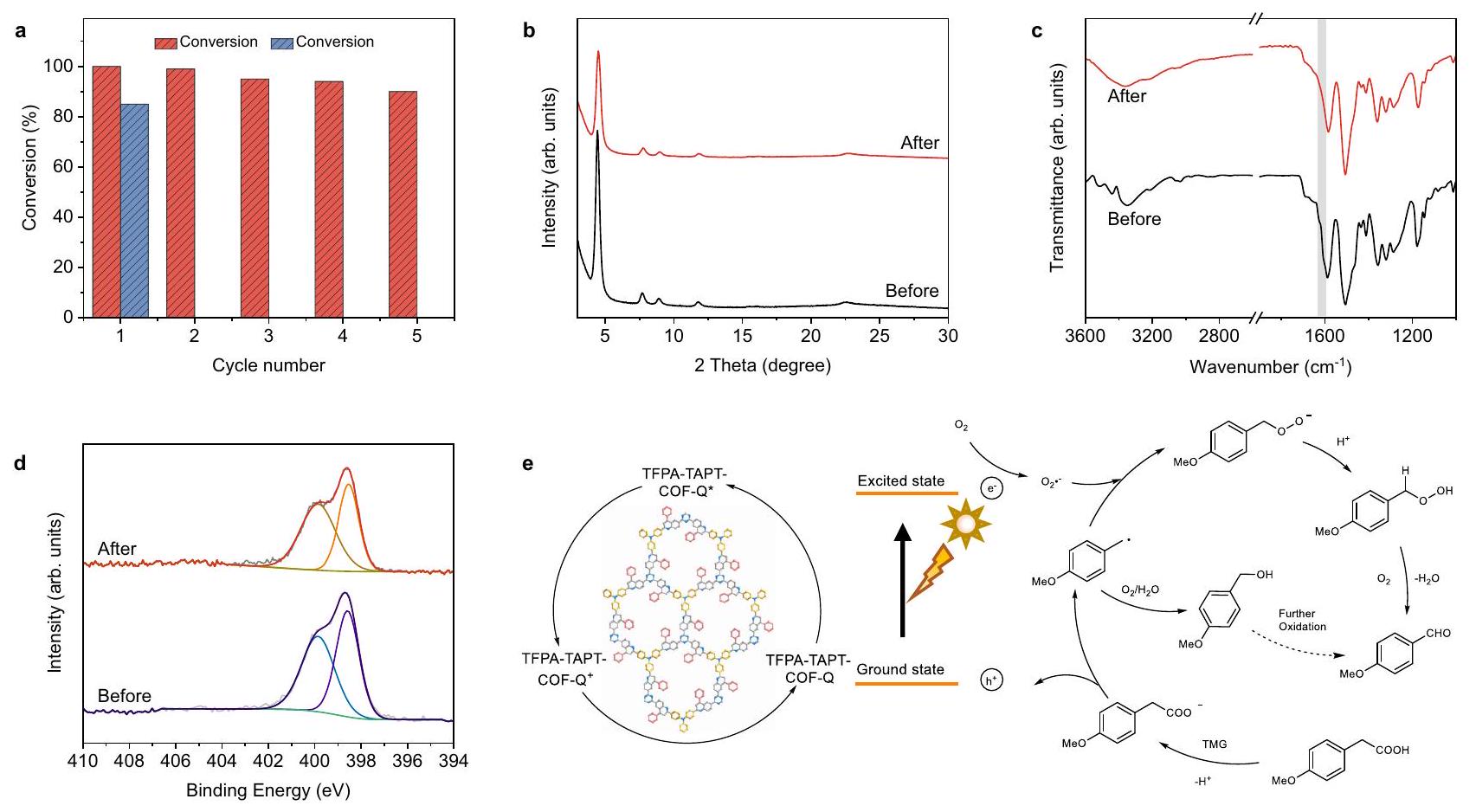 out for TFPA-TPB-COF-Q, and the same outcomes as the first cycle of reaction were detected in all five recycling runs although its photoactivity is not as high as that of TFPA-TAPT-COF-Q (Supplementary Figs. 46-49). These results demonstrated that the quinoline-linked COFs, TFPA-TAPT-COF-Q and TFPA-TPB-COF-Q, can be used as effective recyclable heterogeneous photocatalysts in relatively harsh organic acid conditions.