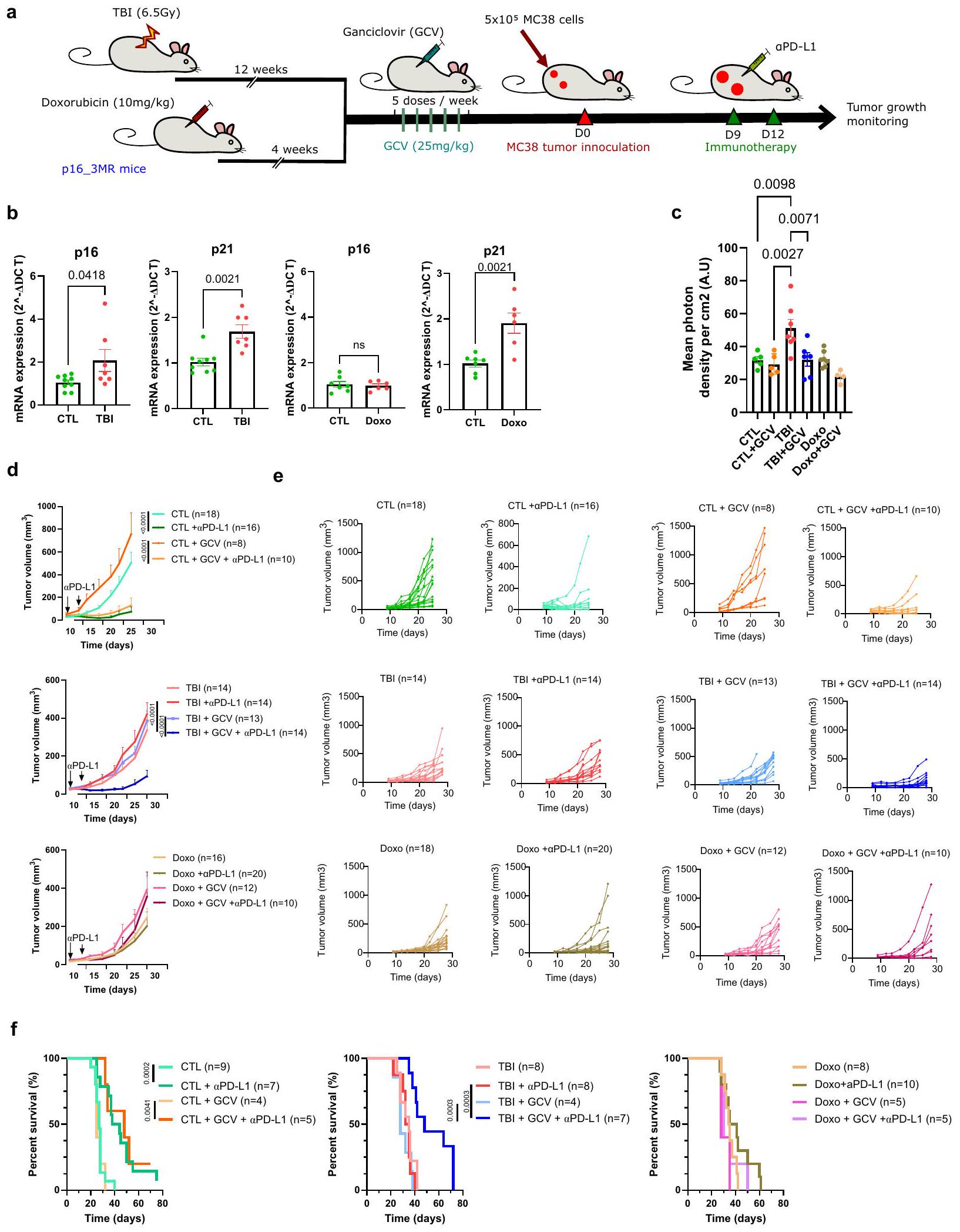Fig. 1 | Senescence leads to immunotherapy resistance. a Schematic of the experiment. In brief, senescence was induced in p16-3MR mice with a single 6.5 Gy sub-lethal dose of total body irradiation (TBI) or following the injection of Doxo ( ). 12 weeks after TBI or 4 weeks after doxorubicin injection, mice were injected intraperitoneally with GCV ( ) for 5 consecutive days to remove senescent cells. 5 days after the last injection of GCV, mice were injected on each flank with MC38 tumor cells expressing mPlum fluorescent protein. Mice were injected with a PD-L1 blocking antibody on days 9 and 12 and tumor growth was evaluated until reaching a limit point. b Relative expression of and was quantified by RT_qPCR in the spleen 10 weeks after induction of senescence with TBI or 4 weeks after Doxo treatments. and and Doxo from independent animals. Two-tailed unpaired -test for in Doxo group, and Mann-Whitney test for in TBI group. Shown is the mean SEM. c p16