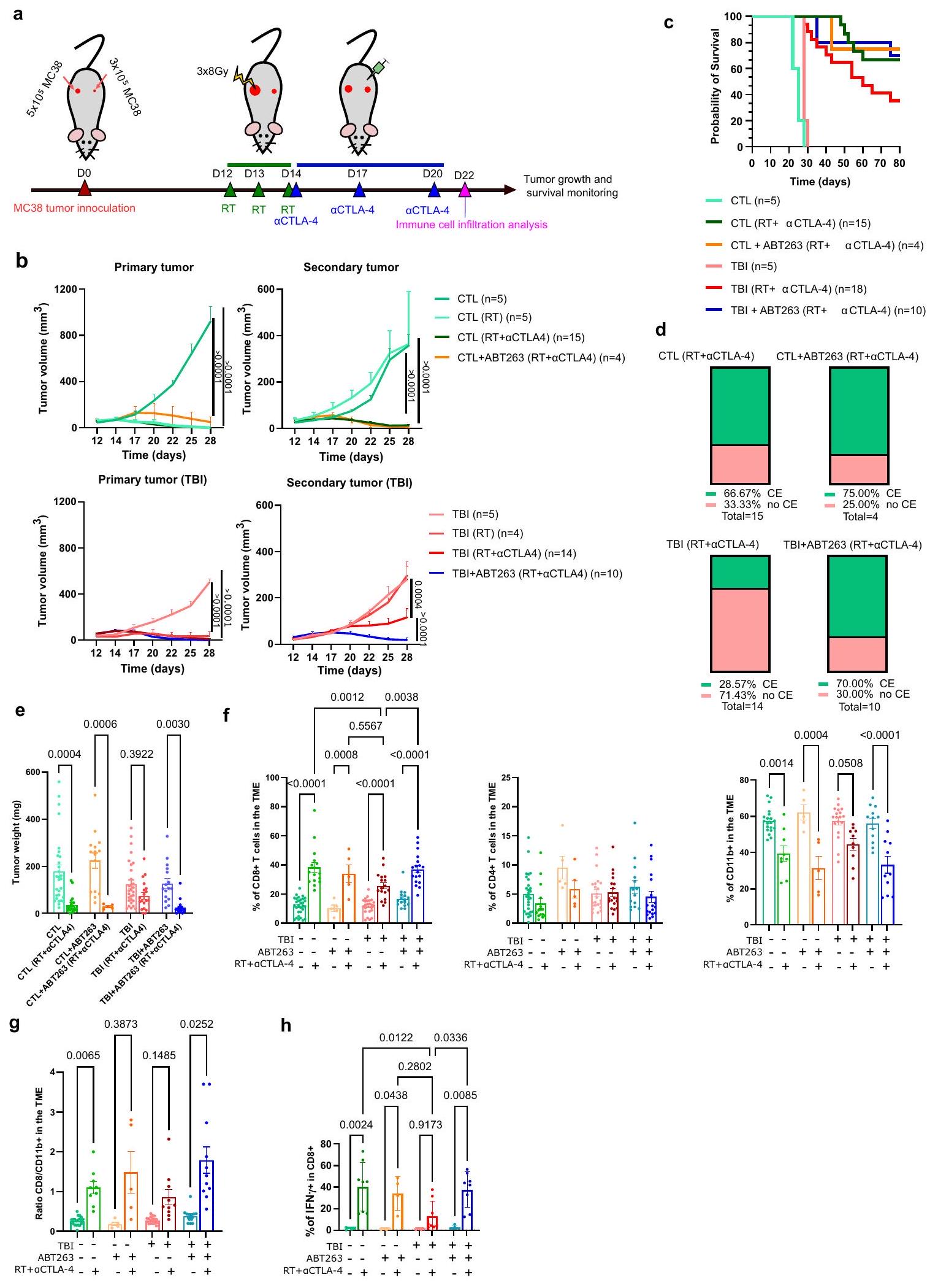 tumor is entirely dependent on CTLA-4 treatment. Using this combination, we observed that the abscopal effect allowed for almost the complete elimination (CE) of the secondary tumor in control mice while the efficacy was reduced in TBI mice (Fig. 3b, d, e). The injection of mice with ABT263 prior to RT enhanced the efficacy of the abscopal effect in TBI mice and improved their survival to a level similar to what we observed in control mice (Fig. 3b, c). Here again, we investigated