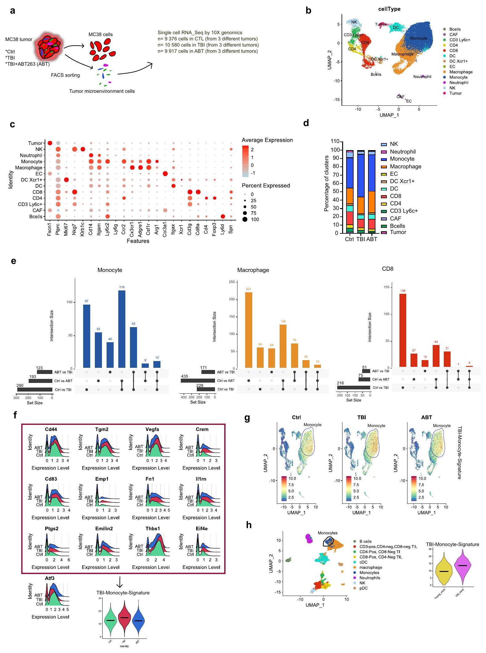 Fig. 4 | The immunosuppressive phenotype of monocytes is partially restored after treatment with ABT263. a Tumors from the indicated groups of mice were collected at day 22 post inoculation and dissociated. Non tumorigenic cells (referred as tumor microenvironment cells) were sorted and used for single-cell transcriptomic analysis in two independent experiments. Each group contains a pool of cells from three tumors. Approximately 10,000 cells for each group were analyzed. b A total of 12 different clusters representing nearly all cells from the TME were generated by Seurat package in R-studio and positioned with U-MAP representation. c Shown is a DotPlot listing the genes which the expression was used to identify the cell clusters generated in panel (b). d Shown is the proportion of individual cell populations from all cells analyzed. e UpsetPlot showing the interaction size (number of DEGs) after samples comparison in monocytes,