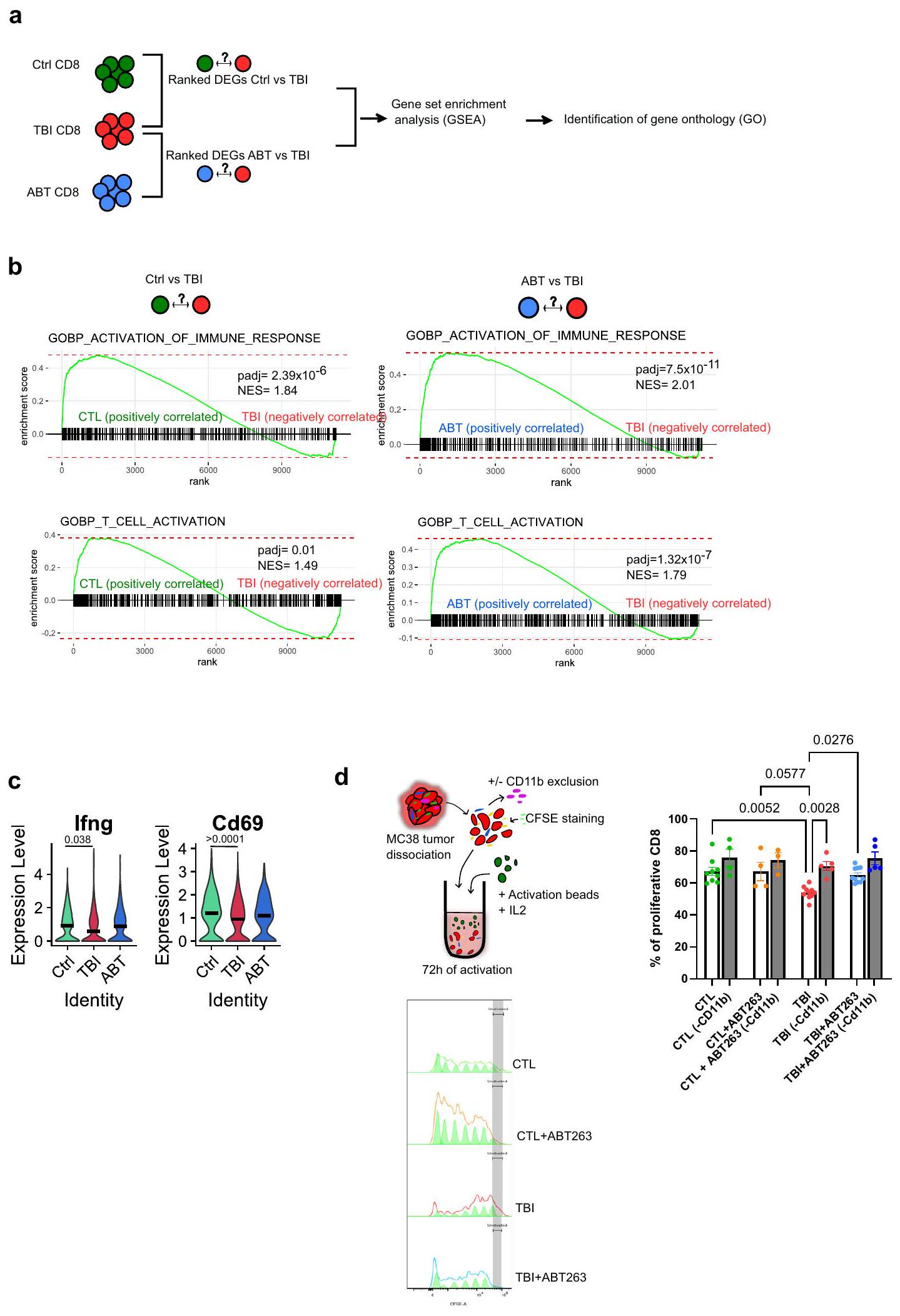 showed restored activation of CD8 T cells after ABT263 treatments (Fig. 5a, b). In line with these observations, the expression of the effector function genes Ifng and Cd69 tended to decreased in CD8 T cells collected from TBI tumors. (Fig. 5c). Therefore, we designed an in vitro assay to measure the impact of myeloid CD11b+ cells on the proliferation of CD8 T cells. As such, CD8 T cells were collected from dissociated tumors and activated with IL2 and CD3/CD28 beads in
