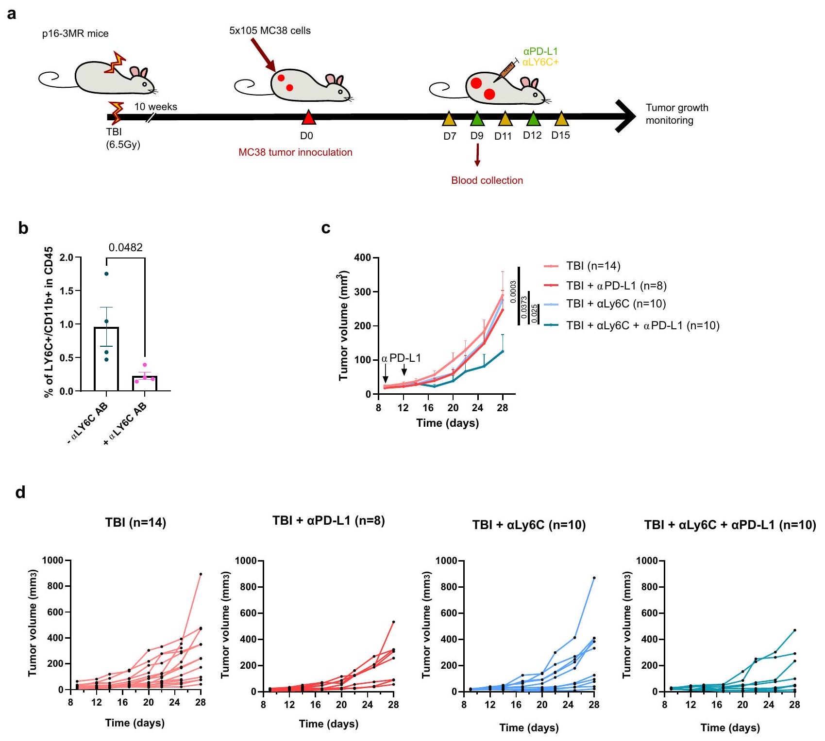presence or after removal of CD11b+ cells. We observed that CD8 T cells collected from tumors of TBI mice proliferated less upon stimulation suggesting that CD11b+ cells were responsible for this inhibition (Fig. 5d). Finally, we depleted Ly6c+ monocytes in TBI mice using a blocking antibody and measured if this would bypass resistance to PD-L1 treatments (Fig. 6a). We first confirmed the depletion of Ly6c + /CD11b + positive cells in blood of TBI mice (Fig. 6b). Then, we observed that only the combination of Ly6c and PD-L1 blocking antibodies could efficiently delay tumor growth in TBI mice (Fig. 6c, d). These results demonstrate that myeloid cells in the context of a senescent environment have an exacerbated immunosuppressive profile and induce resistance to immunotherapy.