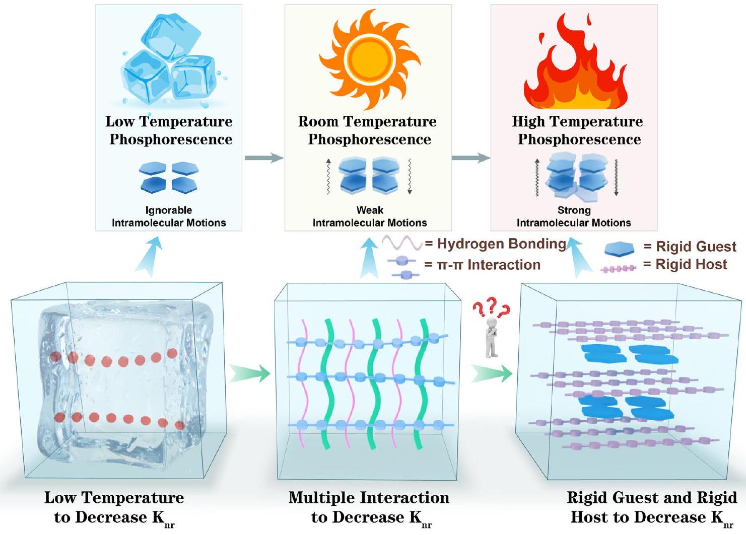 تم ابتكار استراتيجية لتحقيق الفوسفوريسنس عالي الحرارة باستخدام جزيئات صلبة مسطحة كضيوف وبوليمرات صلبة كوسط مضيف. يمكن أن تقاوم التكوين الصلب المسطح اهتزاز الضيف الحراري عند درجات حرارة عالية، وتزيد صلابة الوسط من مقاومة الضيف للحرارة العالية. تظهر المواد المدعومة توهجًا بعد 40 ثانية عند