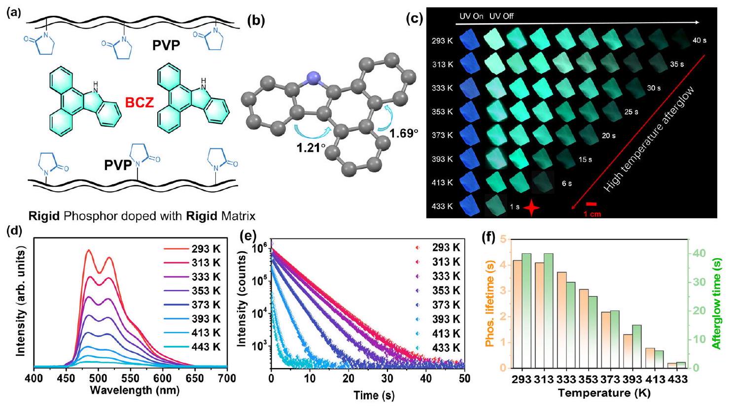 A strategy is pioneered for achieving high-temperature phosphorescence using planar rigid molecules as guests and rigid polymers as host matrix. The planar rigid configuration can resist the thermal vibration of the guest at high temperatures, and the rigidity of the matrix further enhances the hightemperature resistance of the guest. The doped materials exhibit an afterglow of 40 s at