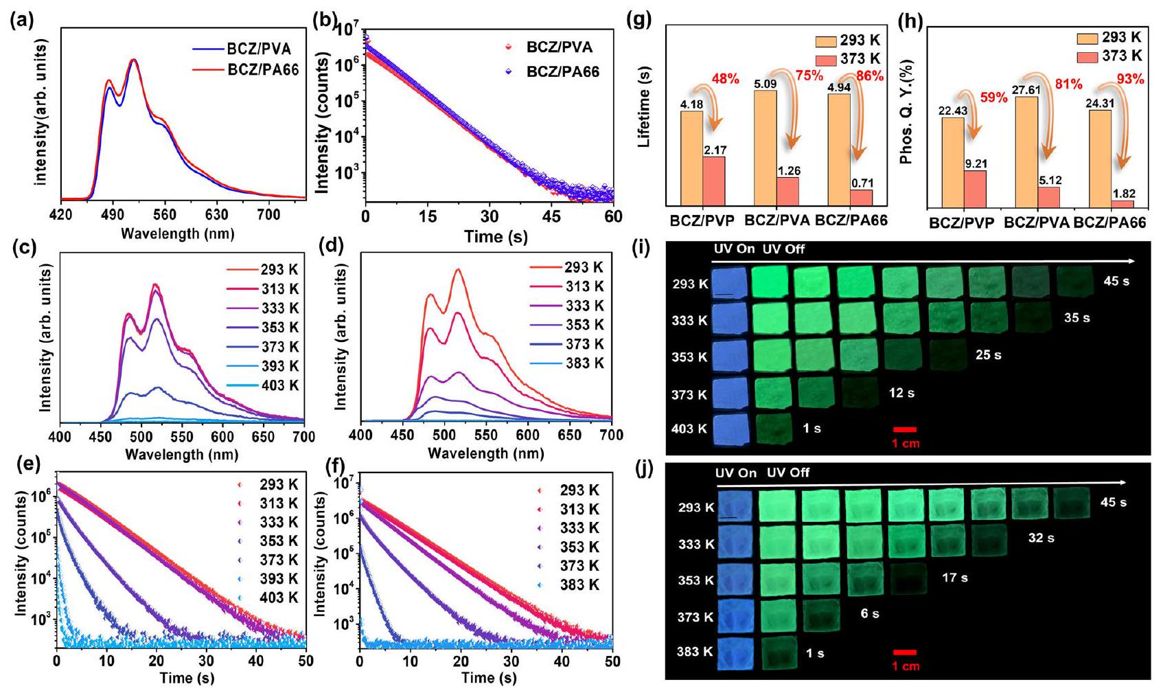 phosphorescence performance of BCZ/PVA and BCZ/PA66 at high temperatures was inferior to that of BCZ/PVP, indicating that host polymers with a low