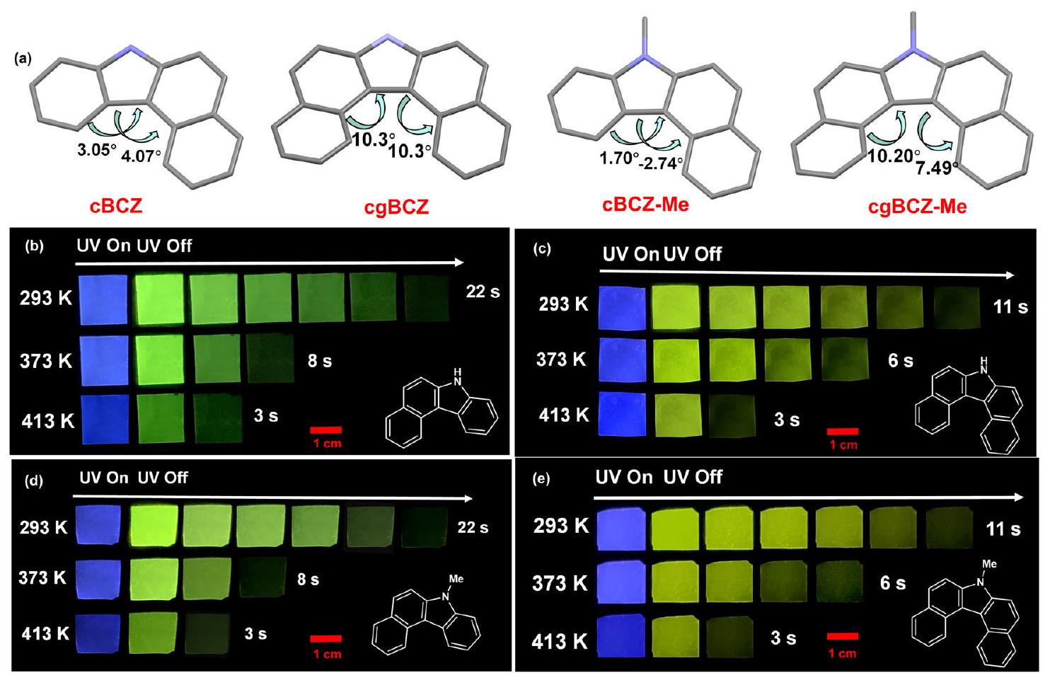 انخفضت بشكل متناسب (الشكل 3f). أظهرت التجارب الضابطة المذكورة أعلاه أن الفشل في تثبيط الحركة الجزيئية يمكن أن يتسبب في ضرر كبير لخصائص HTP للمواد العضوية، وأكدت أن اختيار جزيئات صلبة مسطحة كضيوف ذات ميل ضعيف للخضوع للحركة الجزيئية هو استراتيجية فعالة لبناء مواد HTP. تم أيضًا اختبار انبعاث الفلورسنت لستة أفلام مخدرة عند درجات حرارة مختلفة. أظهر انبعاث الفلورسنت لـ BCZ/PVP وBCZ-Me/PVP وBCZ-nBu/PVP خصائص مقاومة لدرجات الحرارة العالية تقريبًا متشابهة؛ بينما من BCZ-Be/PVP إلى BCZ-TPA/PVP، انخفضت قدرة مقاومة درجات الحرارة العالية لانبعاث الفلورسنت تدريجيًا (الشكل التكميلي 18). ومع ذلك، بسبب الاستقرار الفائق للحالات المثارة الأحادية مقارنة بالحالات المثارة الثلاثية، كان الانخفاض في شدة الفلورسنت للأفلام المخدرة أقل من ذلك في شدة الفوسفور.