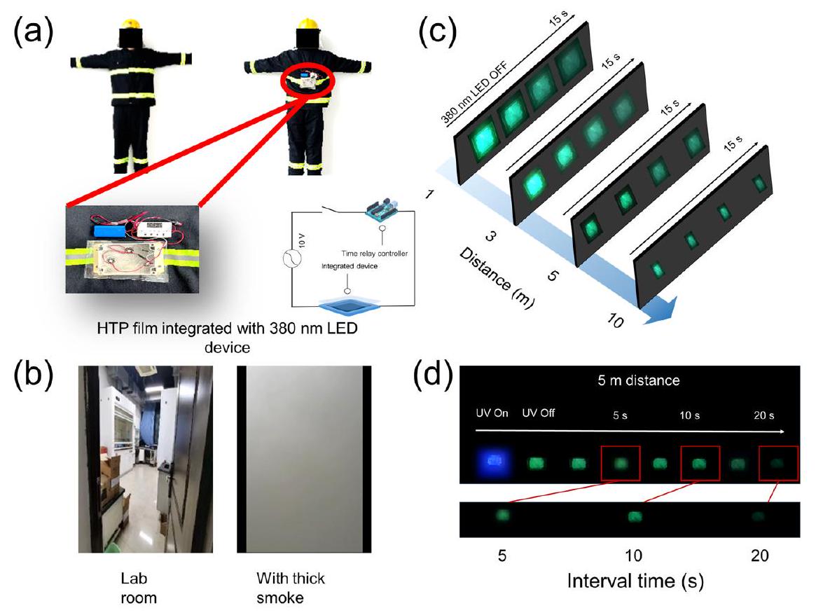 وبيئات الدخان الكثيف. قدرة اختراق الدخان لمصادر الإضاءة مثل الفلورية والفوسفورية أقوى من تلك الخاصة بمصادر الإضاءة المتوهجة مثل المصابيح العادية. بالإضافة إلى ذلك، فإن المواد الفوسفورية ذات زمن التوهج الطويل لا تتطلب تحفيزًا مستمرًا، مما لا يوفر الكهرباء فحسب، بل يقلل أيضًا من إشعاع مصدر التحفيز على جسم الإنسان. لذلك، فإن المواد الفوسفورية مناسبة للتعرف الضوئي في عمليات البحث والإنقاذ. ومع ذلك، فإن المواد الفوسفورية العضوية التقليدية حساسة لدرجة الحرارة، ويمكن أن تؤدي درجات الحرارة العالية الناتجة عن الحرائق إلى إخماد انبعاث الفوسفور بشكل كبير. لذلك، من المتوقع أن تساعد مادة الفوسفور ذات العمر الطويل والمقاومة لدرجات الحرارة العالية التي تم تصميمها في هذه الدراسة في تحديد رجال الإطفاء أثناء عمليات الإنقاذ ومكافحة الحرائق. وبناءً عليه، تم إعداد جهاز مريح ينبعث منه الفوسفور عند تحفيز بسيط. يتكون الجهاز من بطارية، ووحدة تحكم، وثلاثة مصابيح تحفيز ضوئي (Ex.
