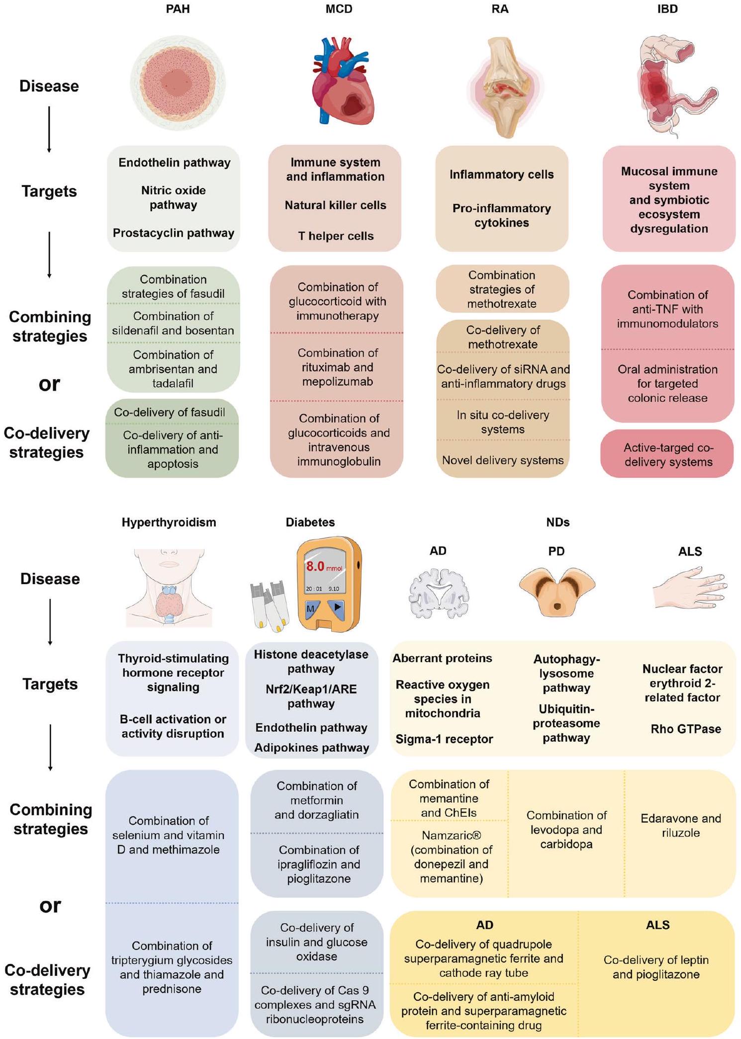 | Disease | Combining or co-delivering drugs | Duration | Patient numbers | Efficacy | Study Phase | References | Additional information | |