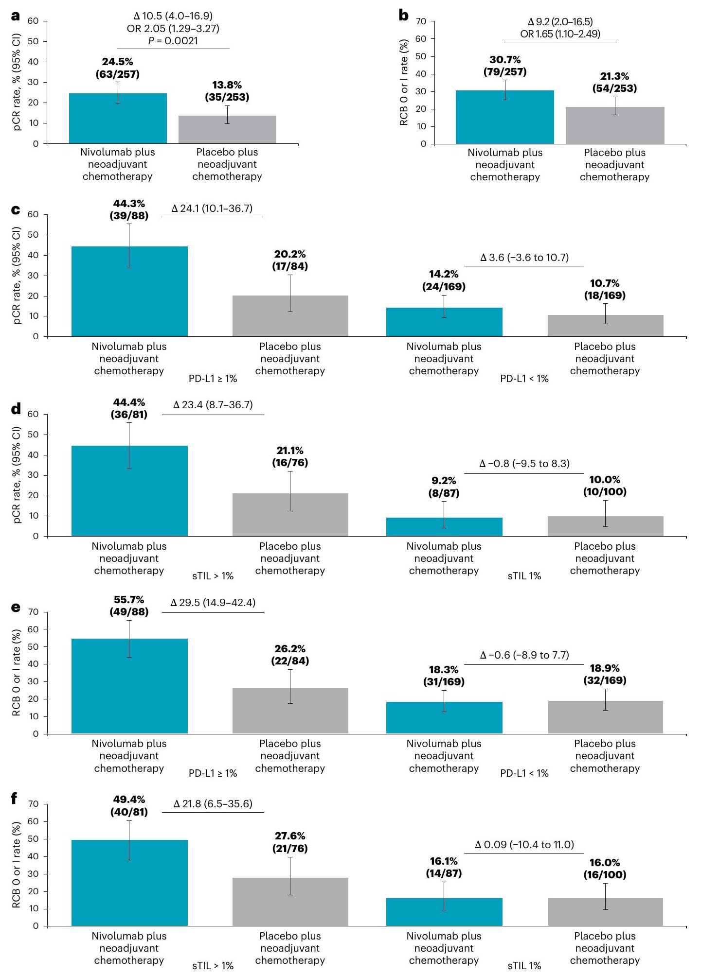 الشكل 2 | نقاط فعالية العلاج للسكان بشكل عام وحسب المجموعات الفرعية. أ، ب، نسبة المرضى الذين لديهم و RCB 0 أو I (ب) لعلاج النيفولوماب بالإضافة إلى العلاج الكيميائي المساعد ( ) والعلاج الوهمي بالإضافة إلى العلاج الكيميائي المساعد ( ) الأسلحة في مجموعة المITT. ج، د، نسبة المرضى الذين حققوا pCR في ذراع نيفولوماب بالإضافة إلى العلاج الكيميائي المساعد وذراع الدواء الوهمي بالإضافة إلى العلاج الكيميائي المساعد حسب حالة PD-L1 أو (ج) وحالة الخلايا اللمفاوية المتسللة إلى الورم الداعم (sTIL) أو نسبة المرضى الذين لديهم معدل RCB 0 أو I حسب حالة PD-L1 أو وحالة sTIL أو ، ) (ف). تُعرض البيانات كنسب مئوية مع أشرطة خطأ تُظهر فترة الثقة حول النسبة الملحوظة للمرضى في مجموعة العلاج. فترات الثقة تم حسابها لكل ذراع علاج باستخدام طريقة كلوبير-بيرسون وفترات الثقة للاختلافات (تم حساب الفروق بين مجموعات العلاج باستخدام طريقة نيوكومب دون تصحيح الاستمرارية. تم تحليل الفرق المعدل حسب الطبقات في معدل الاستجابة الكاملة للعلاج (pCR) بين المجموعتين باستخدام طريقة كوشران-مانتل-هانزل الموزونة مع مستوى ألفا ثنائي الجانب منتم تقييم OR المعدل حسب الطبقات باستخدام طريقة مانتل-هانزل (أ، ب). عدد المرضى الذين لديهم pCR أو RCB 0 أووإجمالي عدد المرضى في كل مجموعة فرعيةمبين فوق كل شريط. قفل قاعدة البيانات: 14 أبريل20 مارس 2024 (د-ف). ن، عدد المرضى الذين حققوا استجابة كاملة (pCR) أو تصنيف RCB 0/I؛ ن، عدد المرضى في كل مجموعة علاجية.