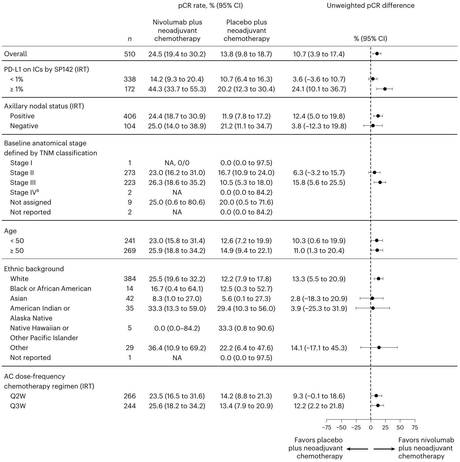 كانت نسبة المرضى الذين عانوا من الاستجابة الكاملة (pCR) أعلى عددياً بين أولئك الذين لديهم أورام إيجابية لمستقبل PD-L1 (خلايا المناعة المتسللة إلى الورم التي تعبر عن PD-L1). IC، ) مقابل أولئك الذين لديهم أورام PD-L1- ( IC، ). الفرق في معدلات pCR ( بين مجموعة نيفولوماب ومجموعة الدواء الوهمي كان (10.1 إلى 36.7) و 3.6 % (-3.6 إلى 10.7) للأورام الإيجابية لـ PD-L1 والأورام السلبية لـ PD-L1، على التوالي (الشكل 2c). كانت تحليلات المجموعات الفرعية لمعدلات pCR متوافقة مع هذه النتائج (الشكل 3).