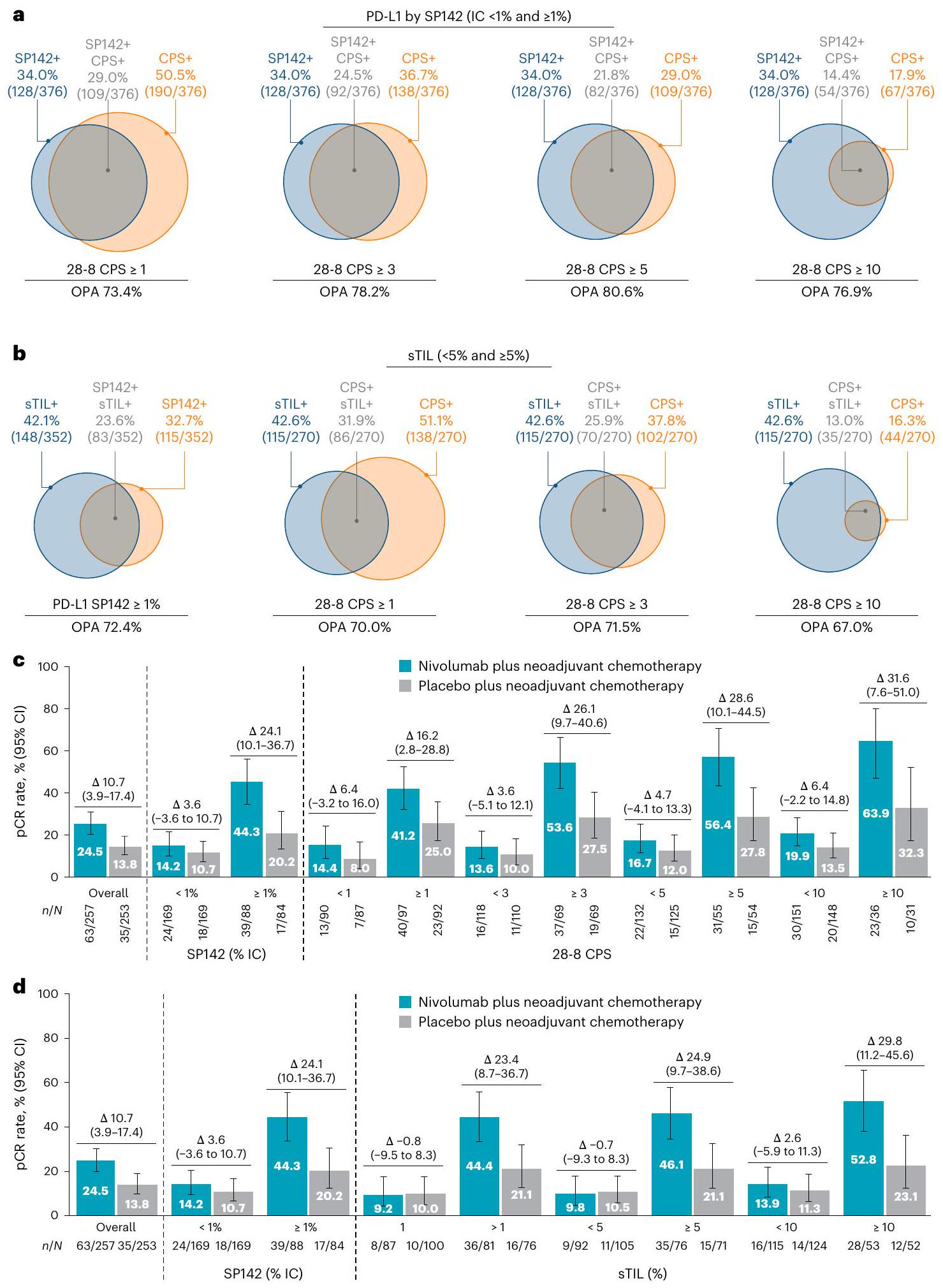 تظهر انتشار الفئات الإيجابية للعلامات البيولوجية في البداية مقسمة حسب نسبة الخلايا اللمفاوية المتسللة إلى الورم (sTILs) عند نقاط قطع مختلفة، مقارنة بتلك التي تم قياسها بواسطة PD-L1 SP142 عند 1% من الخلايا المناعية، في الشكل التوضيحي 7. كانت مستويات sTIL المتوسطة والوسطية و (s.d., 24.16 )، على التوالي، وكانت نسبة إيجابية السTIL متوازنة عبر مجموعات العلاج. تعريف المرضى الإيجابيين للسTIL على أنهم أولئك الذين لديهم مستويات قابلة للاكتشاف من السTIL (>1%)، كانت نسبة الاتفاق العامة بين اكتشاف السTIL وقطع PD-L1 المختلفة بواسطة الخلايا المناعية أو CPS تتراوح بين و (الشكل 4ب). زادت معدلات pCR و RCB 0 أو I مع نيفولوماب مقابل الدواء الوهمي في المرضى الذين لديهم مستويات أعلى من sTIL (الأشكال 2د، ف و 4د). عندما تم استخدام كل من اختبارات sTIL و PD-L1، لوحظت أعلى معدلات pCR في المرضى الذين اعتُبرت فيهما كل من تعبير sTIL و PD-L1 إيجابياً، ولكن من الجدير بالذكر أنه كان هناك أيضاً فائدة من نيفولوماب للمرضى الذين لديهم عدم تطابق بين PD-L1 <1% IC و sTIL+ (الشكل التكميلية 8). كانت معدلات pCR و RCB 0 أو I أعلى في المرضى الذين كانت أورامهم تحتوي على تعبير أقل لمستقبلات هرمون الاستروجين (<50%) و/أو مستقبلات البروجستيرون. ) من المرضى الذين كانت أورامهم تحتوي على مستويات أعلى من مستقبلات الاستروجين أو البروجستيرون