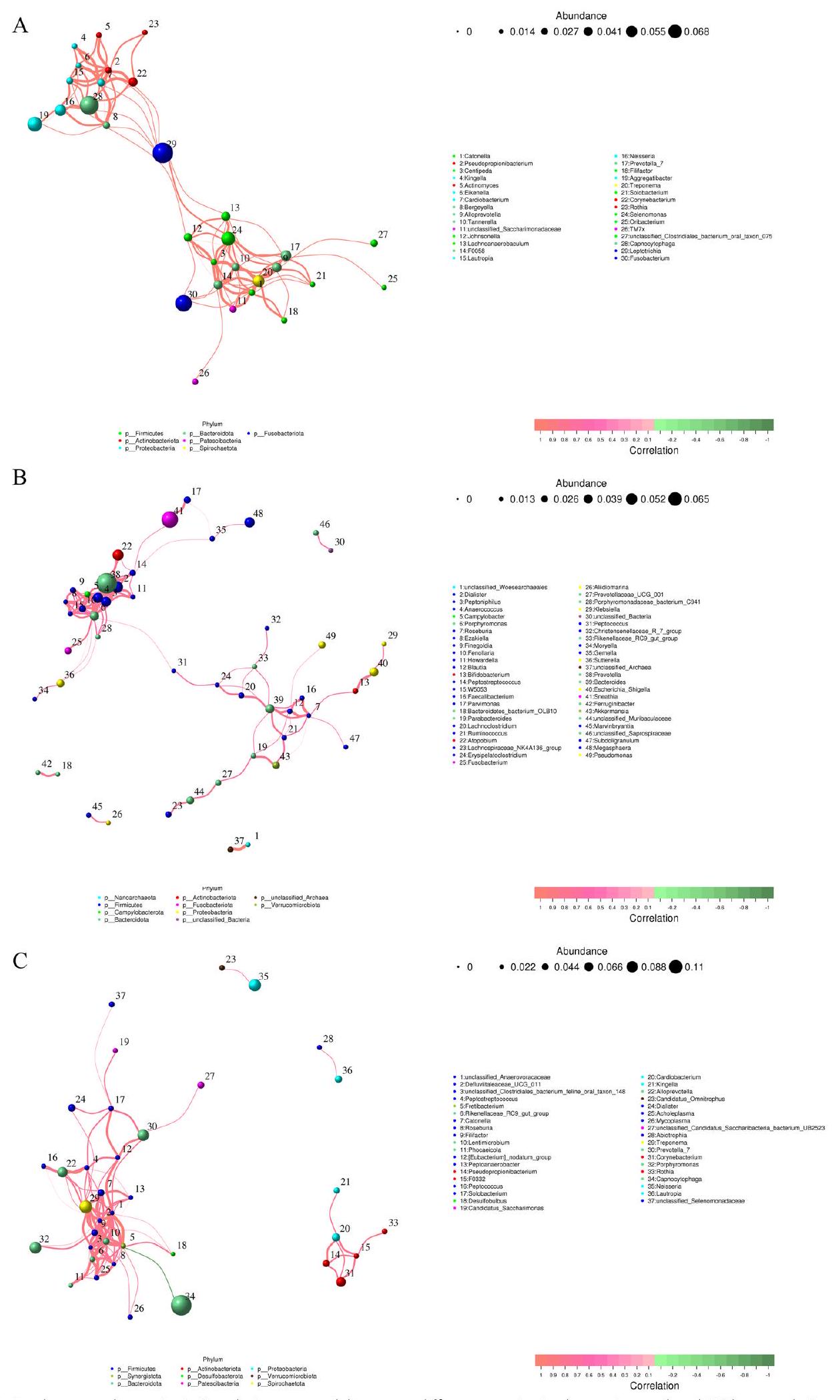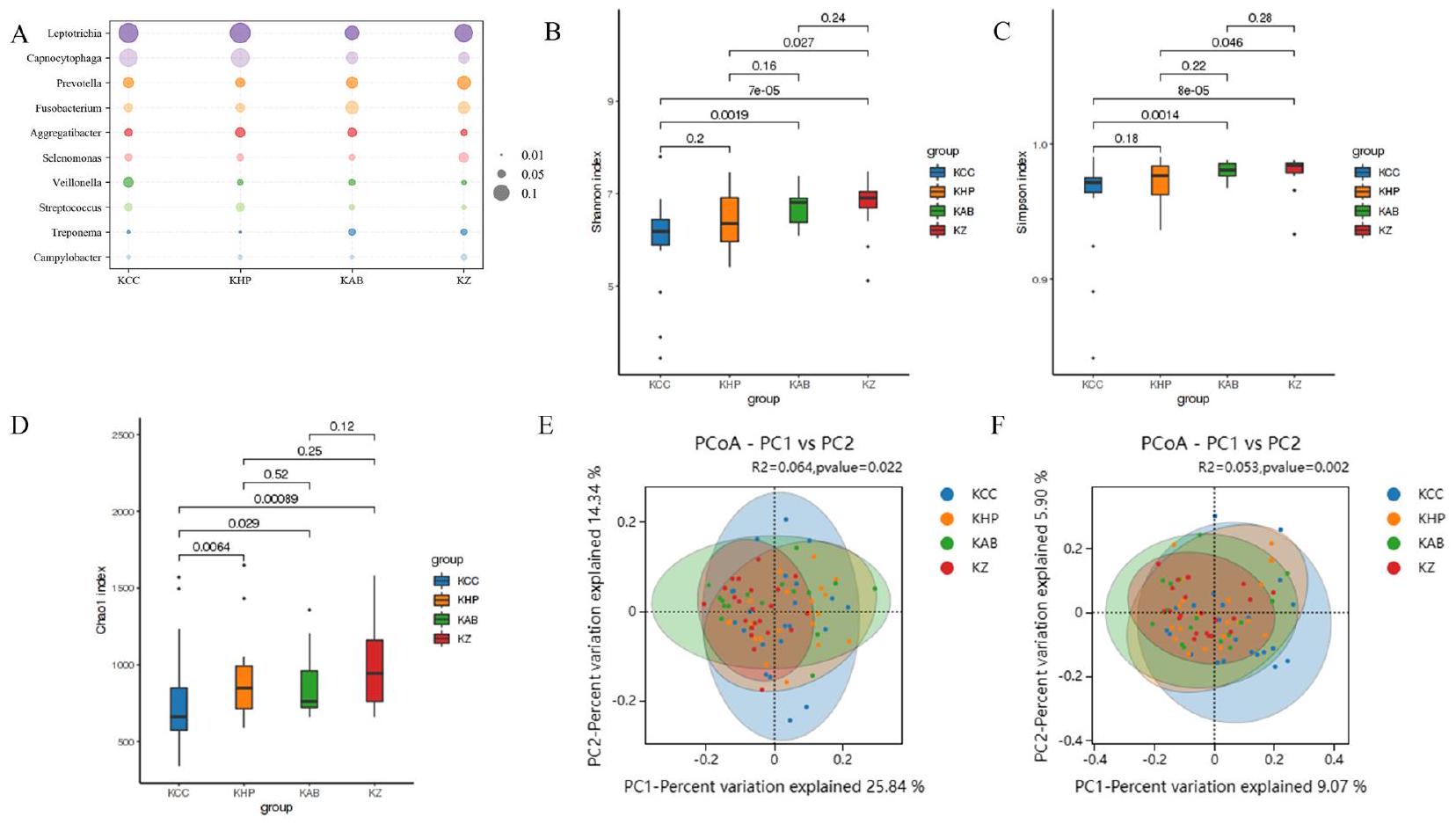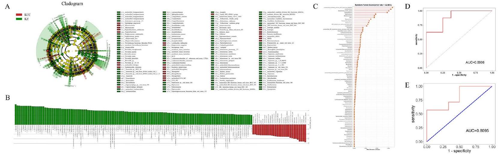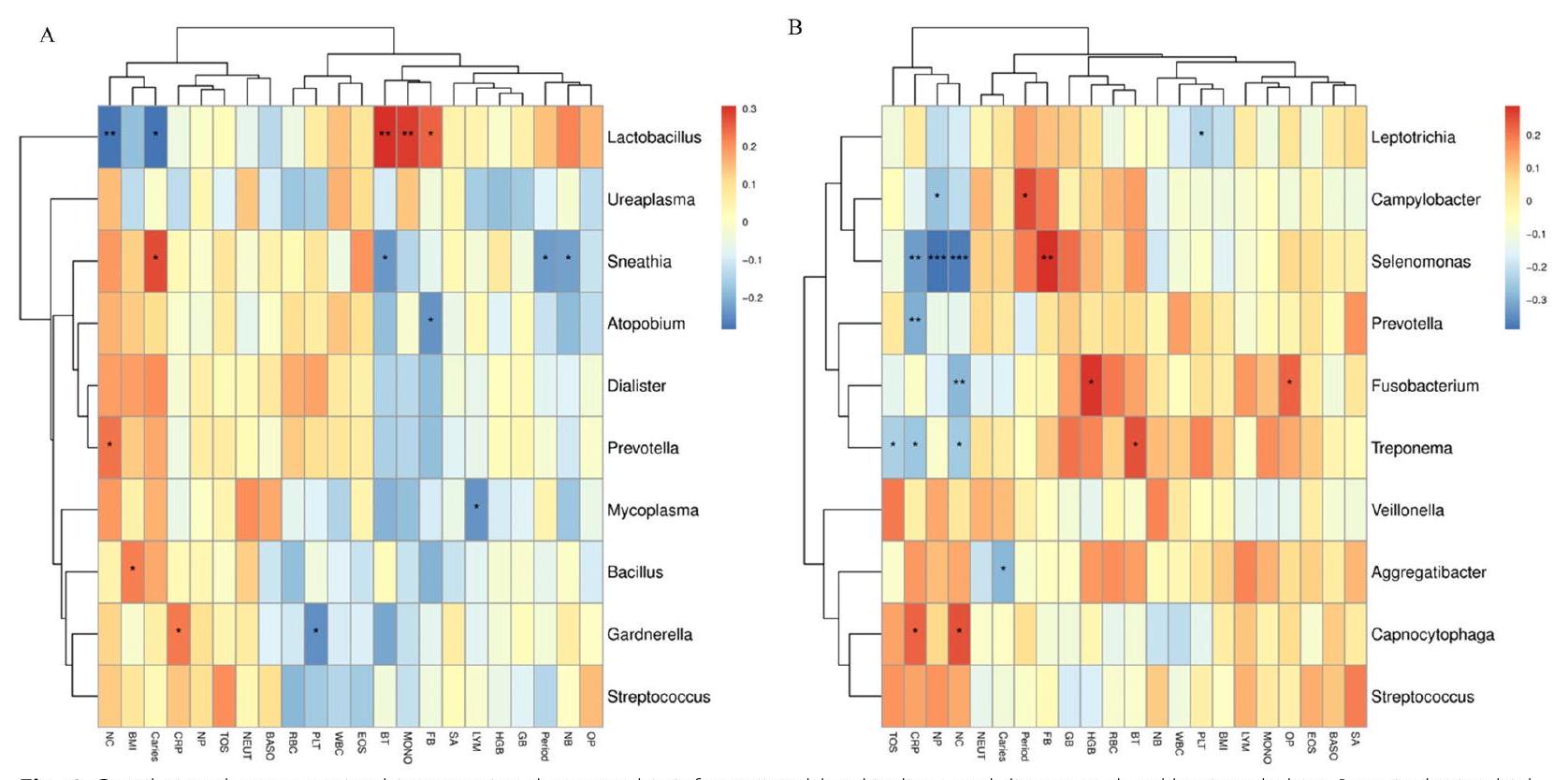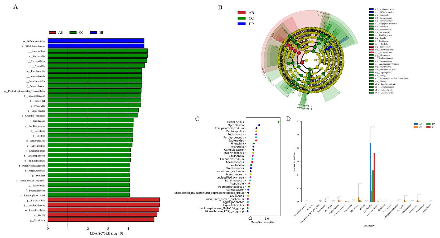 تباينت علامات LDA وLEfSe للميكروبيوم تحت اللثة بشكل عكسي مع تلك الخاصة بالميكروبيوم المهبلي، حيث كانت اللويحات في مجموعة التحكم (KZZ) تحتوي على أكثر الأنواع تميزًا، بما في ذلك Prevotella وSelenomonas وSaccharibacteria وCampylobacter وAmnipila وCentipeda.