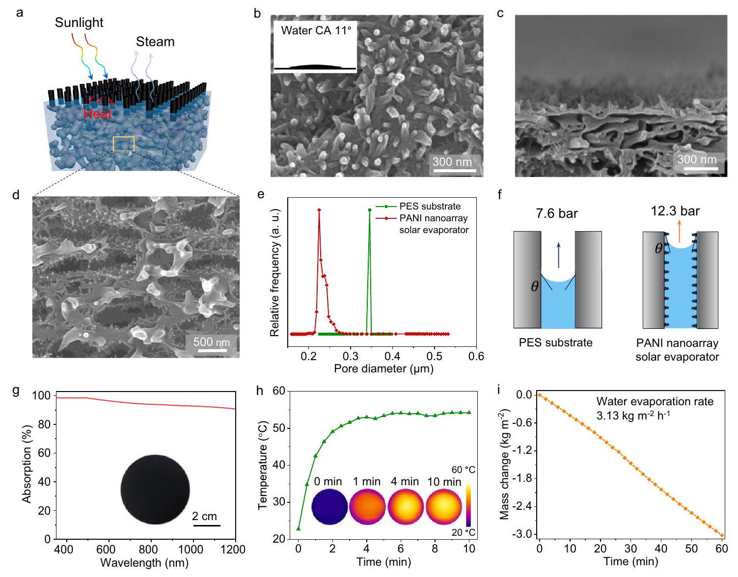 Figure 2a demonstrates the schematic illustration of the PANI nanoarrays solar evaporator. The PANI nanoarrays were grown in situ