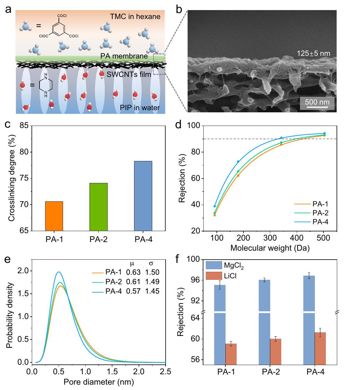 A membrane with high mono-/di-valent ion separation performance is highly required to extract lithium from brine effectively. State-of-the-art mono-/di-valent ion separation membranes are based on a thin film composite design, which deposits a PA selective layer, formed by interfacial polymerization between piperazine (PIP) and trimesoyl chloride (TMC), on the top of porous substrate. We have previously reported that deposition of a thin layer of single-walled carbon nanotubes (SWCNTs) film on macroporous PES membrane greatly improves the quality of the obtained PA layer thanks to the high porosity, smoothness, and narrowly distributed pores of the SWCNT film . Following previous studies , PA membranes were fabricated on the surface of SWCNTs film via interfacial polymerization (Fig. 3a). Firstly, a thin SWCNT film was prepared through vacuum-filtrating a certain amount of SWCNTs dispersion onto a PES membrane with pore size of . The surface SEM image of SWCNTs film shows that a network porous structure was formed from interconnected carbon nanotubes with a high porosity (Supplementary Fig. 2a). Then a typical interfacial polymerization process was conducted on the surface of SWCNT film, in which PIP and TMC reacted at water-hexane interface to form the PA layer. A smooth PA layer was formed after the interfacial polymerization process using TMC and PIP solutions (Supplementary Fig. 2b).