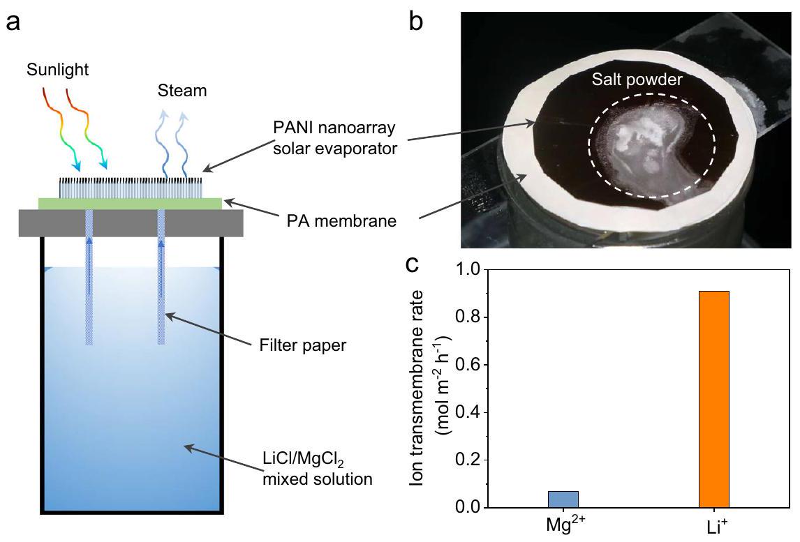 مستوحى من عملية الامتصاص الانتقائي للأيونات وإفراز الأملاح في أشجار المانغروف، نستخدم التأثير التآزري لغشاء فصل الأيونات والمبخر المدفوع بالطاقة الشمسية لاستخلاص مباشر لمسحوق كلوريد الليثيوم (LiCl) من محاليل بحيرات الملح. توضح الشكل 1ج هيكل المبخر المدفوع بالطاقة الشمسية المعتمد على الغشاء، المكون من ثلاث طبقات وظيفية. لتحقيق كفاءة تحويل ضوئية حرارية عالية، تم اختيار مصفوفة ألياف نانوية من البوليانيلين (PANI) مصطفة عمودياً كطبقة ضوئية حرارية علوية نظرًا لقدرتها على امتصاص ضوء الشمس. في الوسط، يوجد غشاء مسامي كبير من بولي(إيثر سلفون) (PES) محب للماء مع قنوات متصلة لنقل الماء، يولد ضغوط شعيرية تعمل كقوة دافعة لنقل الماء. في الأسفل يوجد غشاء فصل الأيونات رقيق جداً من البولي أميد (PA) يسمح بـللاختراق ومنع أيونات متعددة التكافؤ الأخرى، مثل و . عند العلاج محلول مختلط، ماء وتنتقل الأيونات عبر غشاء PA للوصول إلى الطبقة الضوئية الحرارية تحت ضغط الشعيرات الدموية. مع استمرار تبخر الماء، يمكن جمع مسحوق LiCl الصلب مباشرة على سطح المبخر. يحافظ المبخر الشمسي المعتمد على غشاء فصل الأيونات هذا على تركيز ليثيوم مستقر حتى عند معالجة محاليل ملحية عالية التركيز. توضح هذه الدراسة القدرة المذهلة على تركيز الليثيوم. وتوفر طريقة فعالة للحصول على ليثيوم عالي النقاء مباشرة من مياه بحيرات الملح باستخدام الطاقة المستدامة فقط.