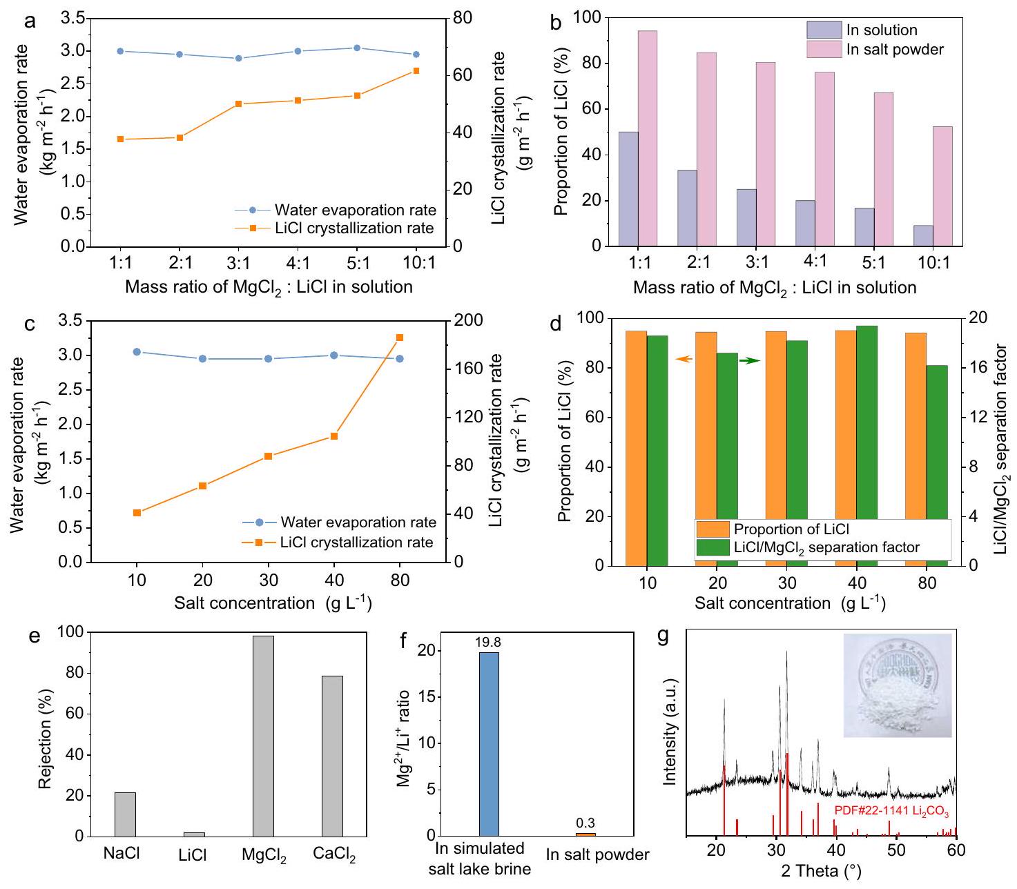 Fig. 5 | Performance of solar-driven lithium extraction. the effect of the ratio on solar-driven lithium extraction. the effect of salt concentrations on solar-driven lithium extraction. The water evaporation rate and salt crystallization rate were measured under 3 sun irradiation. e Salt rejection when evaporating a simulated salt-lake brine. ratio in simulated salt-lake brine