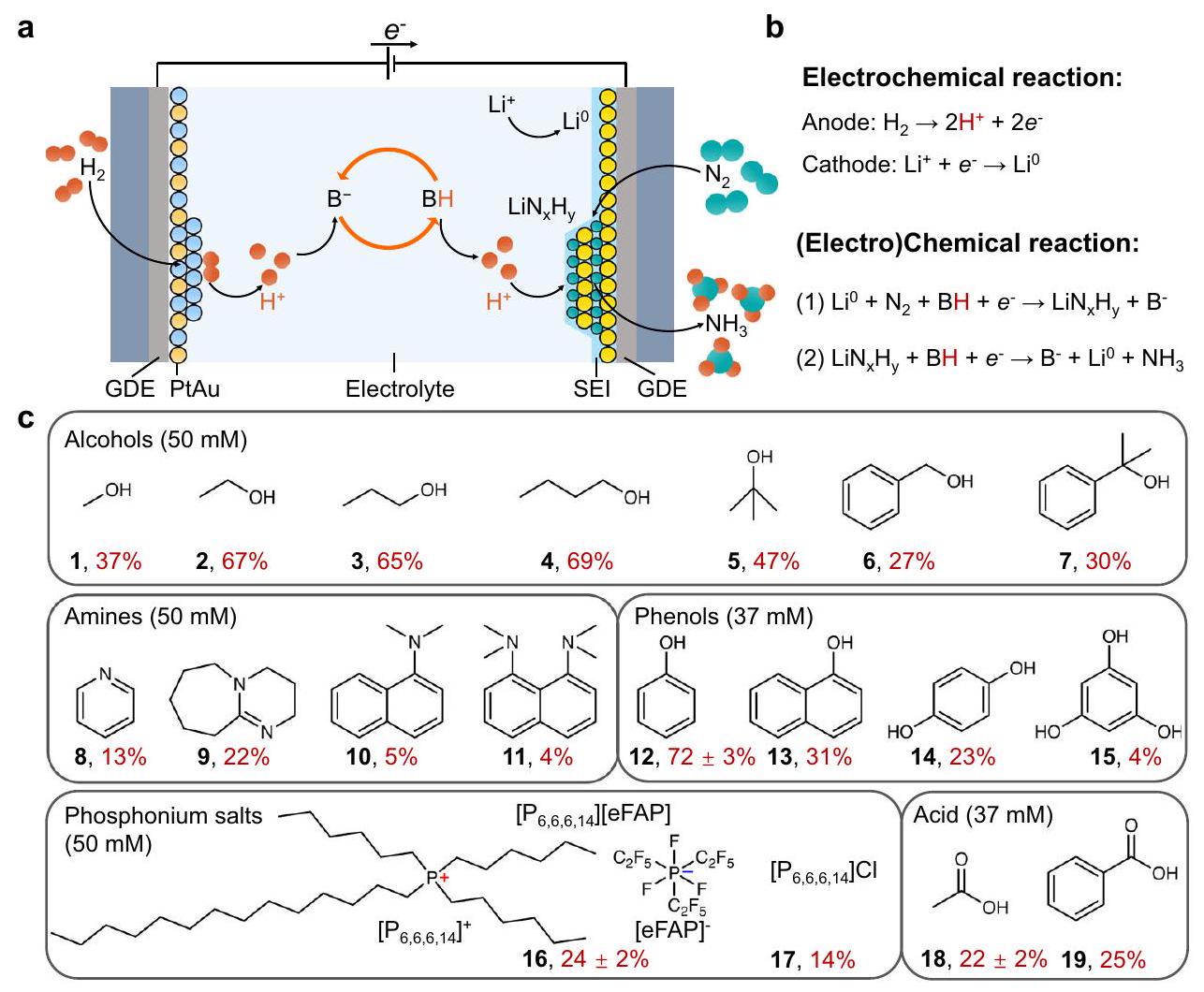 الأمونيالقد شكلت عملية التخليق حضارتنا الحديثة وستستمر في لعب دور رئيسي في مستقبل كوكبنا، وذلك بفضل الأمونيا التي تُستخدم كمواد أولية لإنتاج الأسمدة والبوليمرات والأدوية والمواد الكيميائية الدقيقة.. حاليًا، يتم تصنيع الأمونيا الصناعية من خلال عملية هابر-بوش باستخدام محفزات قائمة على الحديد تحت درجات حرارة وضغوط عالية (أي، و بار)، الذي يساهممن انبعاثات ثاني أكسيد الكربون العالميةتتطلب عملية هابر-بوش ضغطًا عاليًا جدًا، وتنطوي على استثمار رأسمالي كبير ومصانع مركزية كبيرة، في حين أن استخدام الأسمدة يتميز باللامركزية. مع انخفاض أسعار الكهرباء المتجددة، تقدم تخليق الأمونيا الكهروكيميائية إمكانية إنتاج الأسمدة بشكل لامركزي في أجهزة مدمجة يمكن ربطها بمصادر الكهرباء المتجددة اللامركزية. هذه التطورات لديها القدرة على تقليل تكلفة الأسمدة في المناطق النائية التي تفتقر إلى شبكات النقل الفعالة من خلال القضاء على الحاجة إلى النقل الواسع.تم بذل جهود هائلة لتحقيق تخليق الأمونيا الكهروكيميائية باستخدام النيتروجين. ( ) والماء كمادة خام ومزود بالطاقة من مصادر متجددة تحت ظروف محيطية حتى الآن، تعتبر طريقة تخليق الأمونيا الكهروكيميائية الأكثر وعدًا وموثوقية هي تفاعل اختزال النيتروجين بوساطة الليثيوم (Li-NRR) في الإلكتروليتات غير المائية.في عام 1930، استكشف فيختير وآخرون أولاً تفاعل اختزال النيتروجين في محلول كحولي من هاليد الليثيوم.تمت دراسة Li-NRR بشكل أعمق بواسطة تسونيتو وآخرين باستخدام رباعي هيدروفوران (THF) مع كميات صغيرة من الإيثانول (EtOH) كإلكتروليت في. اقترحت مجموعتنا إجراءً صارمًا مع تنقية الغاز وقياسات النظائر الكمية لتجنب النتائج الإيجابية الكاذبة، مما أكد أن الأمونيا المنتجة خلال عملية اختزال النيتروجين بالليثيوم كانت منتقليلمنذ ذلك الحين، تم اقتراح العديد من الاستراتيجيات لتحسين أداء نظام Li-NRR.. مؤخرًا، كثافة التيار العالية ( وكفاءة فاراداي (FE) نحو الأمونيا (قريب من تم تحقيق ذلك في مفاعل دفعي مضغوط (15 بار أو 20 بار)، ولكن تم أكسدة المذيب عند الأنود.يمكن أن يؤدي أكسدة المذيب (مثل THF و EtOH) إلى توليد البروتونات اللازمة لإنتاج الأمونيا.بشكل عام،