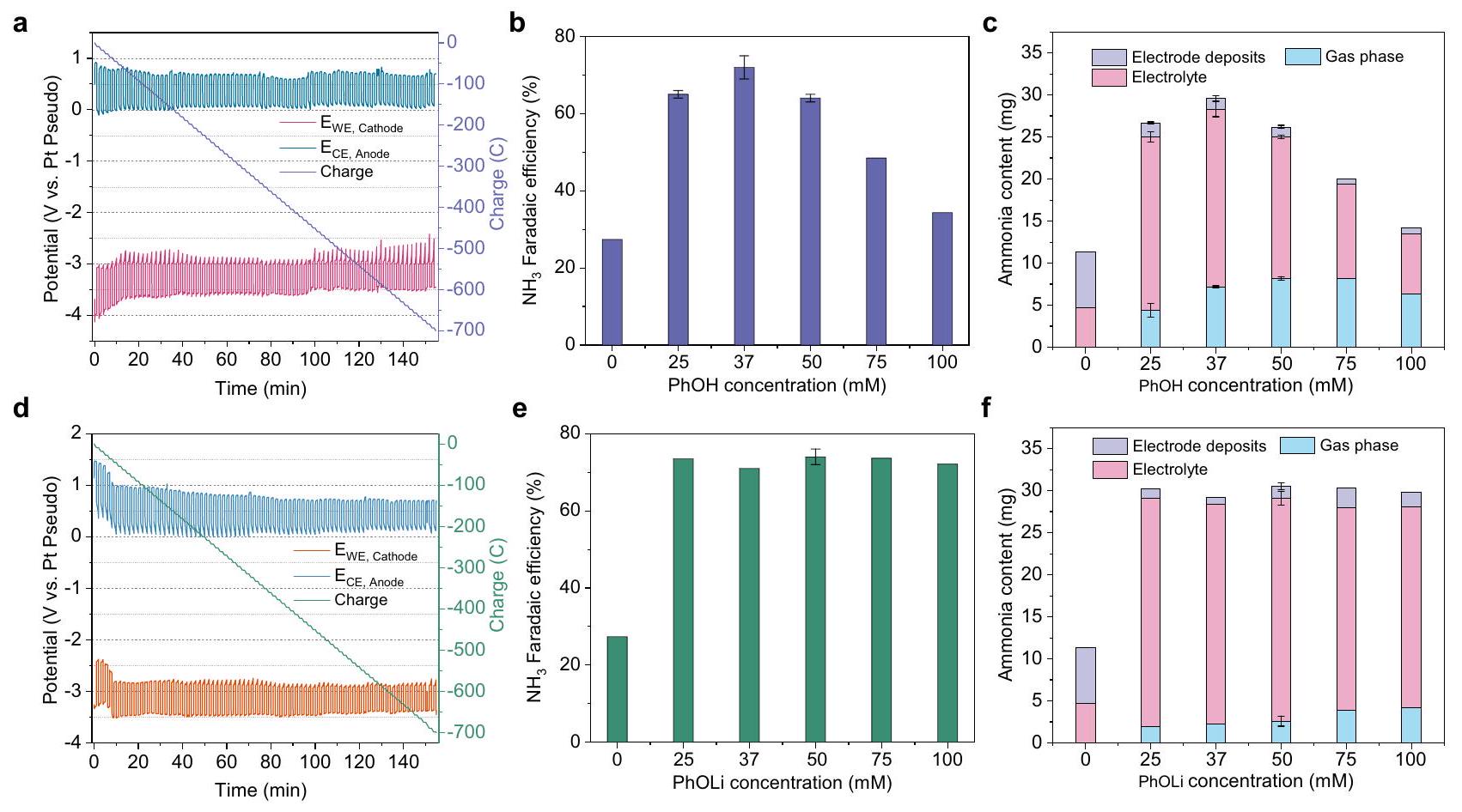 لتقديم مزيد من الأدلة على قدرة ناقل البروتونات على نقل البروتونات في عملية Li-NRR الفعلية، نقترح إجراء يتضمن استخدام الشكل المنزوع البروتونات () من ناقل البروتون لتقييم قدرته على نقل البروتونات. بالإضافة إلى ذلك، عندما تم تحديد أنجح ناقل بروتون، نقترح استخدام مطيافية الكتلة المعززة بالمت isotopes (أي، تفاعل أكسدة الديوتيريوم) لتأكيد أن الهيدروجين الموجود في الأمونيا المنتجة يأتي من تفاعل أكسدة الهيدروجين. أولاً، تم استبدال الفينول (PhOH) بالفينوكسييد الليثيوم (PhOLi) لتقييم أدائه في عملية Li-NRR. توضح الشكل 2d قدرة PhOLi، حيث يظهر أن جهد الأنود والكاتود متوافقان مع تلك الموضحة في الشكل 2a. خلال الدقائق العشر الأولى من القدرة (الشكل 2d)، تم تغيير جهد الأنود والكاتود، وهو ما يمكن أن يُعزى إلى الانخفاض النسبي في