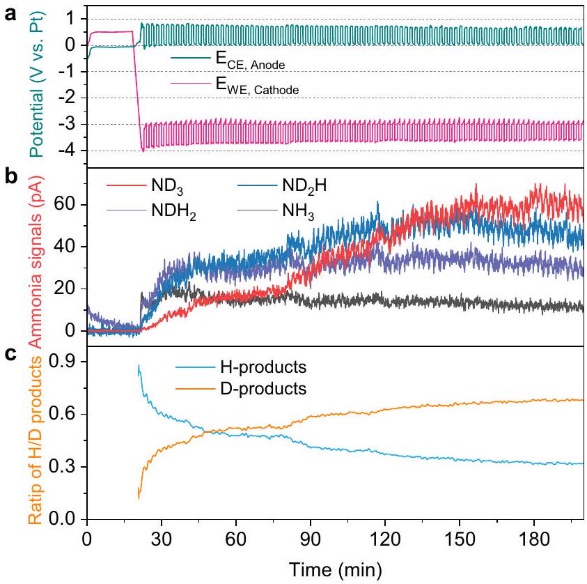 Fig. 3 | Operando mass spectrometry of cathodic ammonia gas products with isotope-labeled deuterium using phenol as proton shuttle. a The chronopotentiometry using phenol as proton shuttle. b Measured gas-phase ammonia when the anode occurs deuterium oxidation reaction. c The corresponding measured relative amounts of D -contained or H -contained ammonia.