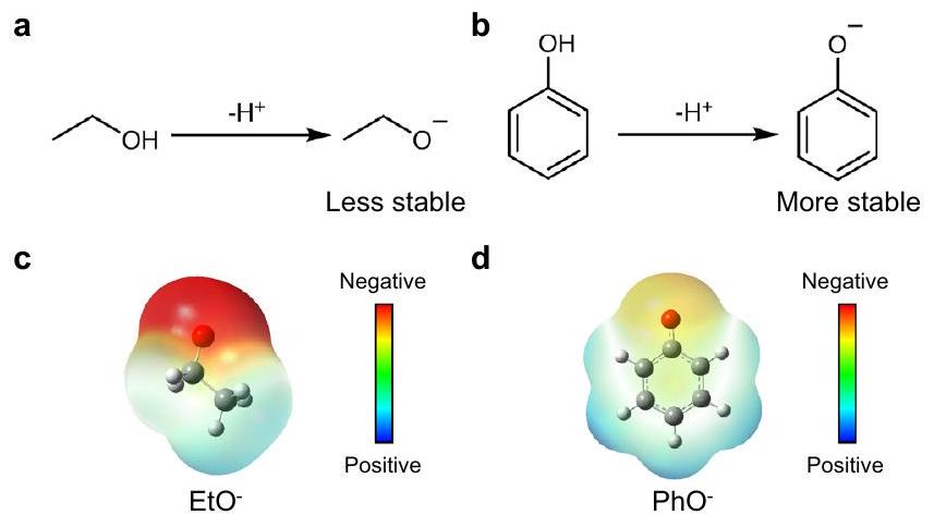 الشكل 5 | استقرار الشكل المنزوع البروتون لوسائط البروتون. أ ب تفاعل منزوع البروتون للإيثانول (أ) والفينول (ب). ج، د خريطة الجهد الكهروستاتيكي لأيون الإيثوكسيد (ج) وأيون الفينوكسايد (د).