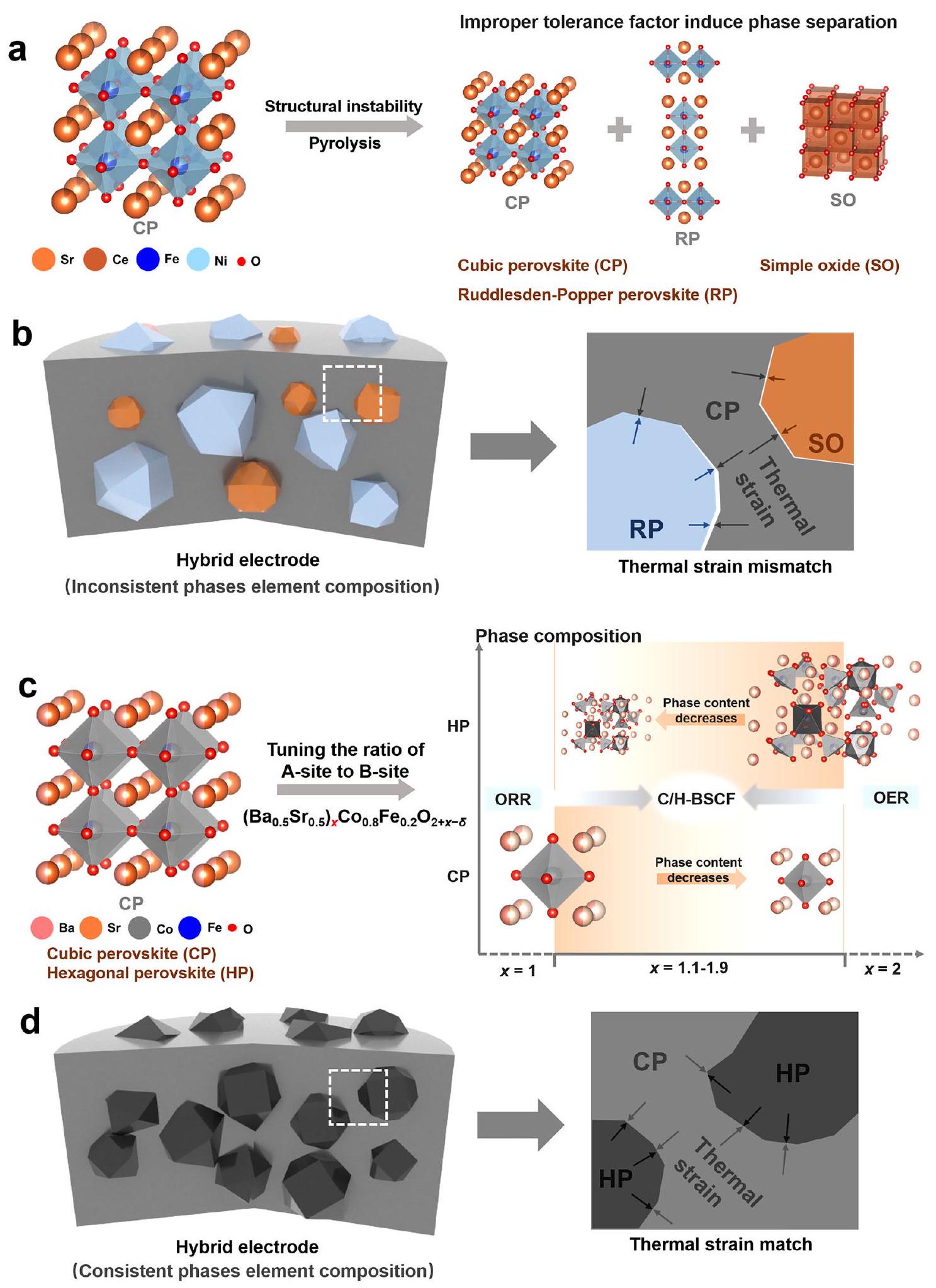 synthesized by improper tolerance factor. The phase content-controlled hybrid electrode composed of cubic and hexagonal perovskites induced by tuning the ratio of A-site to B-site of cubic perovskite. d Thermal stress match for hybrid electrodes with consistent phase element composition.