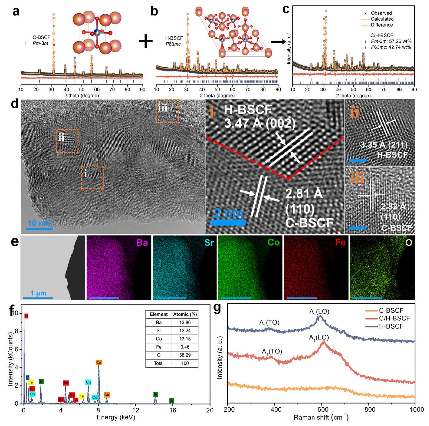 لتأكيد وجود كل من الأطوار المكعبة والسداسية في أكسيد C/H-BSCF بدقة أكبر، تم جمع صورة مجهر إلكتروني ناقل عالي الدقة (HR-TEM). في الشكل 2d، يُلاحظ بوضوح وجود اتصال وثيق بين المستوى البلوري (110) للطور المكعب والمستوى البلوري (002) للطور السداسي في منطقة الإطار (i). من الواضح أنه يمكن ملاحظة المستوى البلوري السداسي (211) والمستوى البلوري المكعب (110) في المواقع (ii) و(iii) على التوالي. علاوة على ذلك، فإن تباعد المستويات البلورية يتوافق مع بيانات تحسين Rietveld للأشعة السينية (XRD) لأكسيد C/H-BSCF الهجين، مما يؤكد وجود هذه المستويات. في الهجين C/H-BSCF، ساهمت الضغوط والتأثيرات البينية الناتجة عن الترتيبات الذرية المختلفة عند واجهة الأطوار C-BSCF (110) وH-BSCF (002) بشكل إيجابي في تعزيز النشاط التحفيزي.تم استخدام صور رسم الخرائط العنصرية TEM-EDX لتحديد الخصائص الكلية لـ C/H-BSCF، والتي كشفت عن توزيع موحد للعناصر على مقياس الميكرون، بالإضافة إلى التحديد الدقيق للنسبة المئوية الذرية لكل عنصر، والتي ظلت متوافقة بشكل وثيق كما ومع ذلك، تعرض ملفات المسح الخطي لمطيافية EDX المحلية لجزيئات C/H-BSCF في الشكل 2e تقلبًا كبيرًا في محتوى العناصر من Ba و Sr، مما يشير إلى وجود طورين (C-BSCF و H-BSCF) في جزيء C/H-BSCF (الشكل التوضيحي 5).تم استخدام مطيافية رامان لتحديد التركيب البلوري والخصائص الاهتزازية لأكاسيد البيروفسكايت.على الرغم من أن الهيكل المكعب المثالي للبيروفسكايت لا يُتوقع أن يظهر نطاقات نشطة في رامان، إلا أن أكاسيد C-BSCF و C/H-BSCF تظهر نطاقات عريضة عندوالذي يمكن أن يُعزى إلى تشويه جان-تيلر للبيروفسكايت المكعب عند درجة حرارة الغرفة (الشكل 2g). علاوة على ذلك، فإن القمم التي لوحظت في و في C/H-BSCF و H-BSCF تشير إلى و أنماط الفونونات الضوئية لمجموعة الفضاء P63mc. لذلك، أكدت طيفيات رامان أيضًا التركيب الثنائي الطور لأكسيد C/H-BSCF في درجة حرارة الغرفة. بالإضافة إلى ذلك، يحافظ C/H-BSCF على هيكل طور وتركيب مستقرين تحت درجات حرارة مختلفة وظروف تكليس طويلة الأمد (الشكل التوضيحي 6).