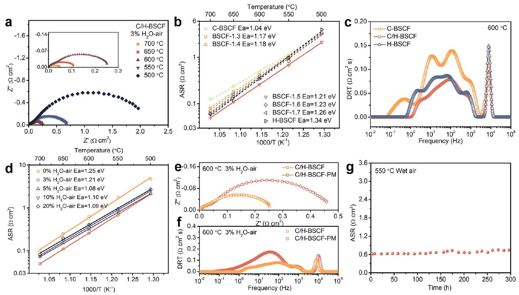 symmetric cell demonstrated a relatively low polarization resistance ( ). As the decreased, the showed a significant increase. The H-BSCF hybrid electrode exhibits the lowest at different oxygen partial pressures at . However, in the HF region, the C-BSCF, H-BSCF, and H-BSCF electrodes show similar and values of about 0.2 , indicating that the charge transfer processes of different electrodes do not significantly discrepancy . The lower of C/H-BSCF electrode is mainly attributed to the decrease in resistance of the IF and LF regions compared to C-BSCF and H-BSCF electrodes, which further suggests that the fast ORR rate of the C/H-BSCF hybrid electrode is mainly attributed to the facilitated diffusion rate of the oxygen ions and the surface mass transfer by the cubic and hexagonal phases, respectively. Moreover, the symmetric cell with C/H-BSCF electrode is evaluated for EIS at different water pressures in order to further demonstrate that the C/H-BSCF hybrid electrode has a strong hydration capacity and proton conductivity (Fig. 3d). The ASR of C/H-BSCF dramatically lowered under -air compared to dry air conditions, for example, falling of from 0.62 to at . This significant reduction in ASR indicates that the C/H-BSCF electrode has a fast hydration reaction rate and excellent proton diffusion capability. However, beyond -air, it is worth noting that the ASR at increased more prominently compared to . This can be attributed to the increased water vapor pressure leading to competition between oxygen and water molecules for adsorption on the electrode surface, thus lowering the ORR rate of the electrode. Additionally, the activation energy gradually decreased as the water pressure increased, suggesting that the C/H-BSCF hybrid electrode has the potential to be utilized as an air electrode in proton-conducting electrochemical cells . In addition to this, the physically mixed C/H-BSCF electrode (C/ H-BSCF-PM) is fabricated via the mechanical mixing of cubic C-BSCF and hexagonal H-BSCF, according to the two-phase ratio of the hybrid C/H-BSCF. The EIS of this electrode is measured on a symmetric cell with ASRs of , and at -air at 700 , , and , respectively (Supplementary Fig. 11). The self-assembled C/H-BSCF electrode exhibited superior catalytic activity compared to the C/H-BSCF-PM electrode. The primary reason for this is attributed to the fact that mechanical mixing results in a poorer distribution and interface of the two phases, which can negatively impact ion transport and surface diffusion, thereby constraining the oxygen activation rate of the electrode (Fig. 3e and Supplementary Fig. 12) . This is confirmed by the DRT analysis of the EIS of both electrodes (Fig. 3f and Supplementary Fig. 13). As demonstrated in Fig. 3 g , the symmetric cell with the C/H-BSCF electrode exhibited good stability over extended periods of testing, with a decay rate of merely for the catalytic activity.