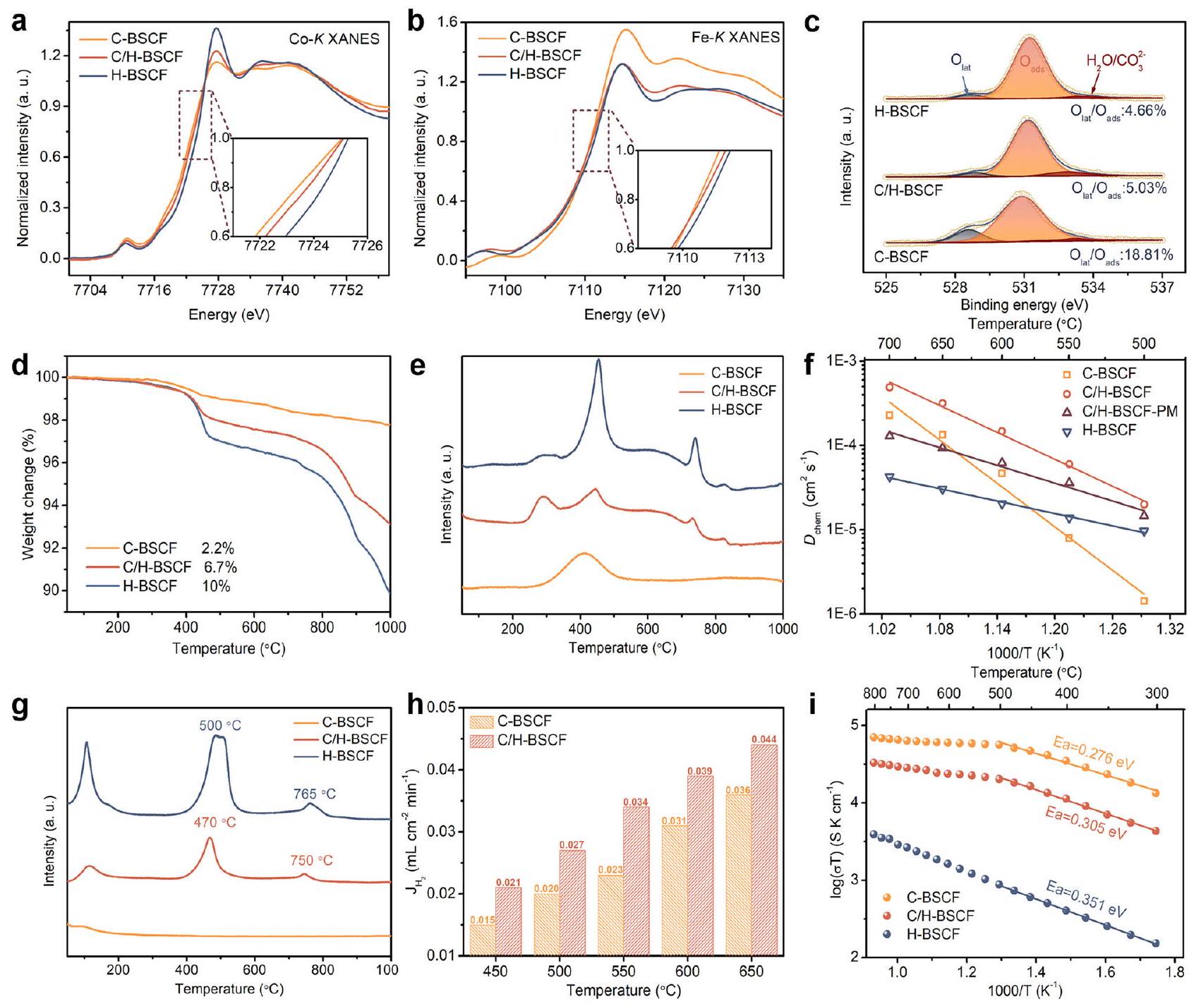 الشكل 4 | تعزيز تفعيل الأكسجين، توصيل الأيونات، وتفاعل الترطيب.كو وحديد-طيف XANES لـ C-BSCF و C/H-BSCF و H-BSCF. يظهر الشكل المصغر تكبيرًا موضعيًا. ج طيف XPS لـ C-BSCF و C/H-BSCF و H-BSCF، موضحًا الهياكل.منحنيات TGA و-ملفات TPD من درجة حرارة الغرفة إلى. و مناسب بواسطة الموصلية الإلكترونية
