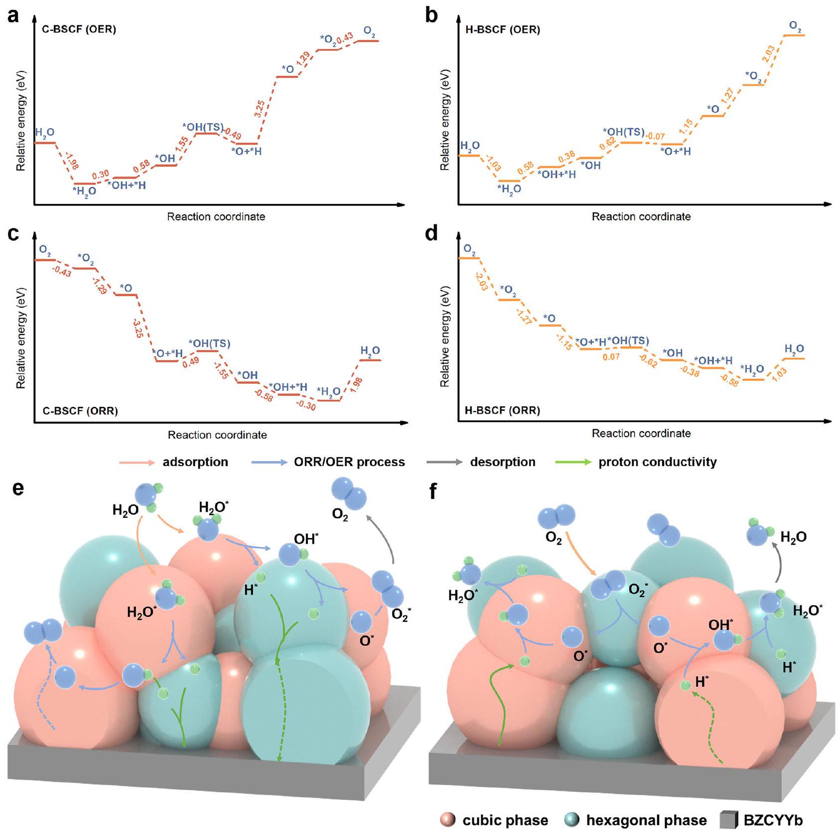 Fig. 5 | DFT calculations regarding the ORR and OER mechanisms on the air electrodes of R-PCECs. The energy barrier of the OER process on the a cubic C-BSCF (100) and hexagonal H-BSCF (0001) surfaces. The energy barrier of the