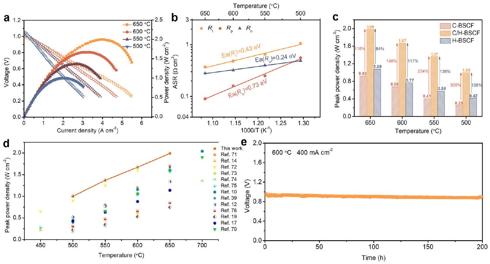 with C-BSCF, C/H-BSCF, and H-BSCF electrodes. d Comparison of PPDs obtained with C/H-BSCF electrode and advanced electrodes in the literature at different temperatures. e Stability test of a single cell with C/H-BSCF air electrode in FC mode.