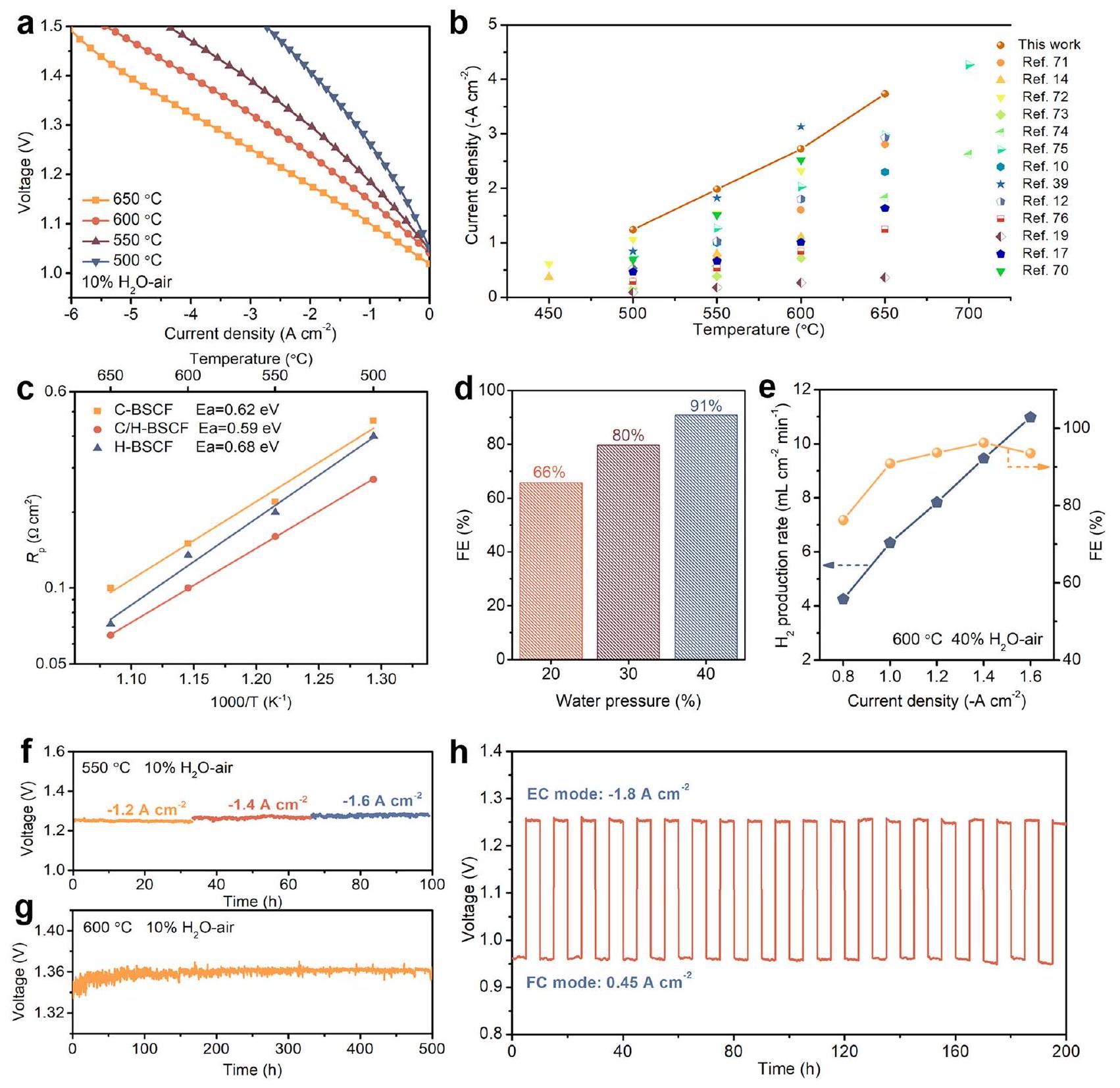 of R-PCEC with C/H-BSCF hybrid electrode while maintaining a current density of at . As shown in Fig. 7d, the FE gradually increases with the increasing water pressure and reaches up to under -air atmosphere. Furthermore, As the current density increases, the FE gradually increases to a maximum value of at . However, when the current density further increased to , the FE dropped to . This drop can be attributed to the positive correlation between the electronic conductivity of the electrolyte and oxygen partial pressure, leading to increased electronic losses . Interestingly, the final FE remained within a reasonable range of approximately (Fig. 7e and Supplementary Fig. 35). However, acceptable FE indicates that C/H-BSCF oxide as an air electrode has a good potential for commercialization. Additionally, Supplementary Fig. 36a displays the XRD patterns of CBSCF, C/H-BSCF, and H-BSCF powders following treatment at under -air. It was discovered that C -BSCF still maintains a cubic phase structure, but that C/H-BSCF and H-BSCF exhibit varying degrees of secondary phase diffraction peaks (Supplementary Fig. 36b). This suggests that the high-water pressure induces the segregation of Ba in the hexagonal phase. It has been demonstrated that can effectively enhance the ORR and OER activities of Ba containing perovskite oxides. Hence, appropriate segregation of Ba in the H-BSCF phase under high water pressure offers greater potential for enhancing electrochemical activity . Figure 7f, g shows the results of tolerance and long-term stability tests on R-PCECs with C/H-BSCF electrodes in EC mode. The cell was tested for 100 h at three current densities of , and at and -air, all of which maintained notable stability (Fig. 7f). Meanwhile, the cell operated stably at a constant current density of at for up to 500 h (Fig. 7 g ), this result greatly outperforms the stability of previous R-PCECs and demonstrates the remarkable stability of the C/H-BSCF hybrid electrode in EC mode. The feasibility of long-term cyclic running of R-PCECs between FC and EC modes is necessary for the operation of large-scale energy conversion. As shown in Fig. 7h, the R-PCEC with C/H-BSCF air electrode underwent 20 cycles for 200 h at . The current densities used were for FC mode and for EC mode. The results revealed excellent reversibility and tolerance of R-PCECs using a C/HBSCF hybrid electrode.
