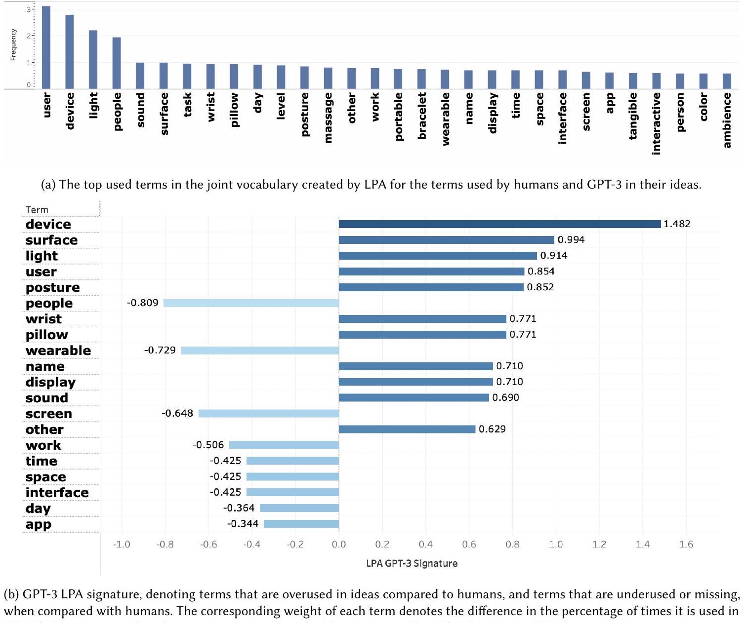 5.2.3 Exploring the Human and LLM solution spaces. To explore the divergence of ideas and the solution space explored with and without LLMs, we evaluated the semantic distribution of ideas generated by humans and by GPT-3, and the terms used in the different solution spaces using LPA.