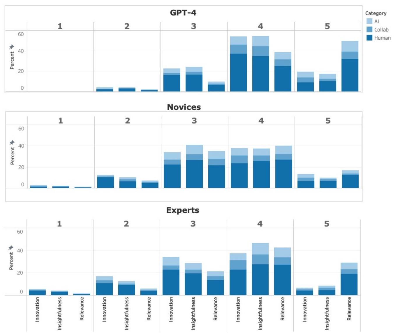 (a) First, we compare the ratings distributions across the evaluator groups. Figure 5 depicts the distribution of ratings on a Likert scale of 1 to 5 given by Experts (lower panel), Novices (middle panel), and GPT-4 (upper panel) for the 148 ideas across the three criteria. For each idea and criterion, the rating was calculated as the average of the ratings given by the corresponding rater group, either Experts, Novices, or GPT-4, to that idea. The ratings distributions demonstrate that the Experts were more critical than the Novices and that GPT-4 gives relatively high ratings to ideas. GPT-4 gave much more ratings of 5 than novices and experts and much less ratings of 2 and 1 . Specifically, it gave a lower rating of 1 to only one idea, for its Insightfulness. GPT-4 gave an average rating of 4.19 for relevance, 3.72 for innovation, and 3.68 for insightfulness.