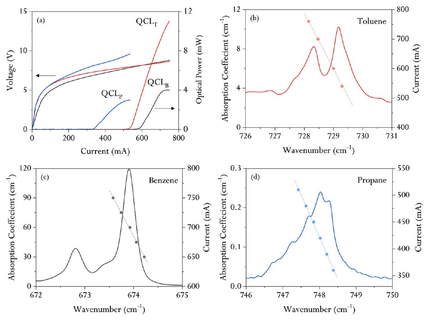 FIG. 2. (a) Optical power vs current and voltage vs current characteristics of (red curves), (black curves), and (blue curves) operating at , and , respectively. (b)-(d) Solid lines represent the simulation of the absorption coefficient for pure toluene, benzene, and propane at atmospheric pressure. The spectra of the absorption coefficient of toluene and benzene are obtained from the NIST database, while the propane spectrum is obtained from the HITRAN database. Dotted lines and solid symbols mark the QCL wavelength tuning ranges as a function of the QCLs’ injection current.