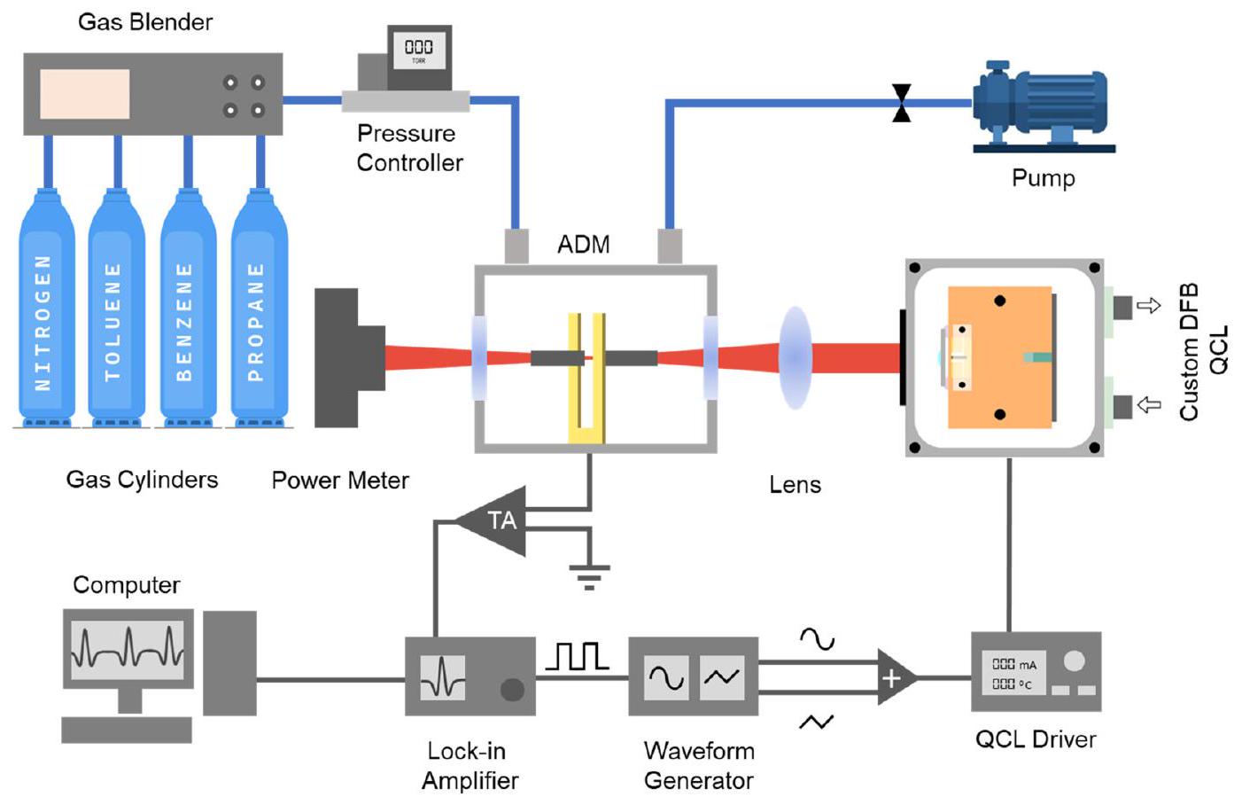 الشكل 3. المخطط التخطيطي لنظام مستشعر QEPAS الذي يستخدم ليزر QCL (ليزر كاسكيد كوانتي موزع التغذية الراجعة) طويل الموجة القائم على InAs. ADM: وحدة الكشف الصوتي و TA: مضخم الترانسيميدنس.