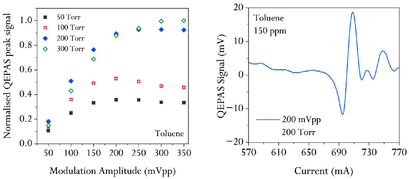 FIG. 5. (left) Normalized QEPAS peak signal of toluene plotted against the laser peak-to-peak modulation amplitude at various pressures. (right) QEPAS signal of 150 ppm of toluene obtained by sweeping the laser injection current within the QCL tuning range at optimal working conditions, i.e., 200 mV peak-to-peak laser current modulation amplitude and 200 Torr.