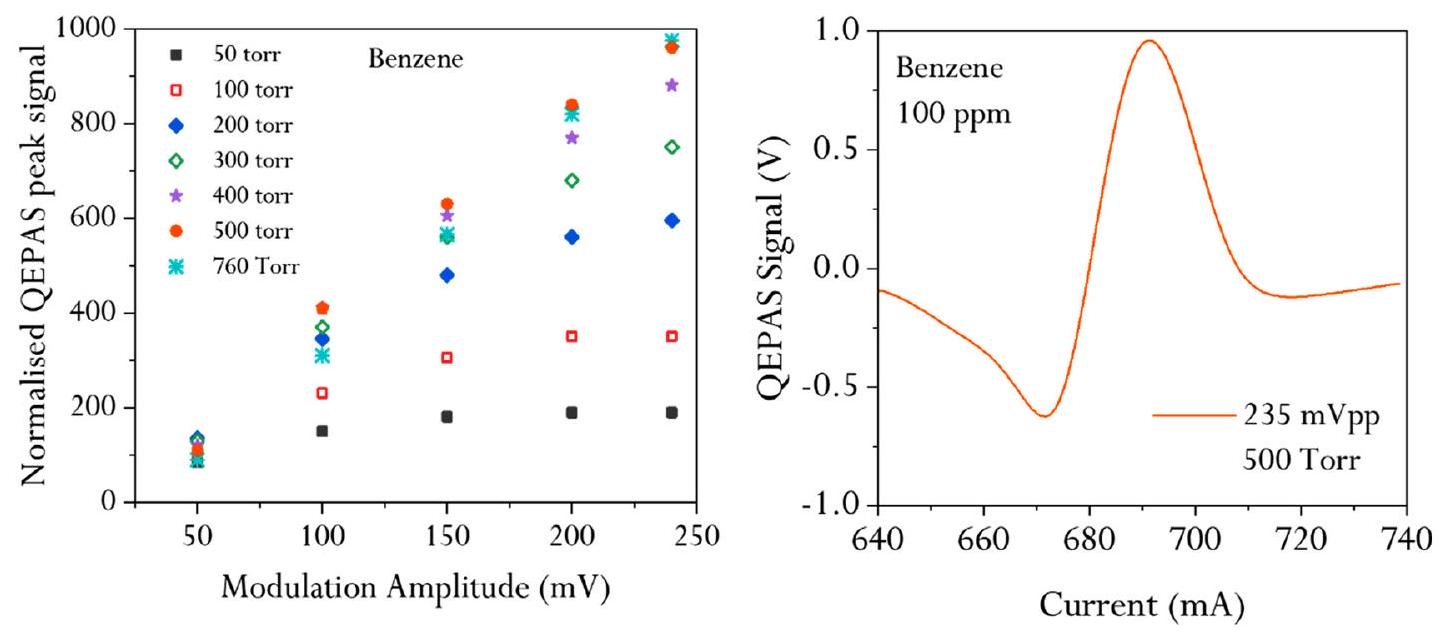 FIG. 6. (left) Normalized QEPAS peak signal of benzene plotted against the laser peak-to-peak modulation amplitude at various pressures. (right) QEPAS signal of 100 ppm of benzene obtained by sweeping the laser injection current within the tuning range at optimal working conditions, i.e., 235 mV peak-to-peak laser current modulation amplitude and 500 Torr.