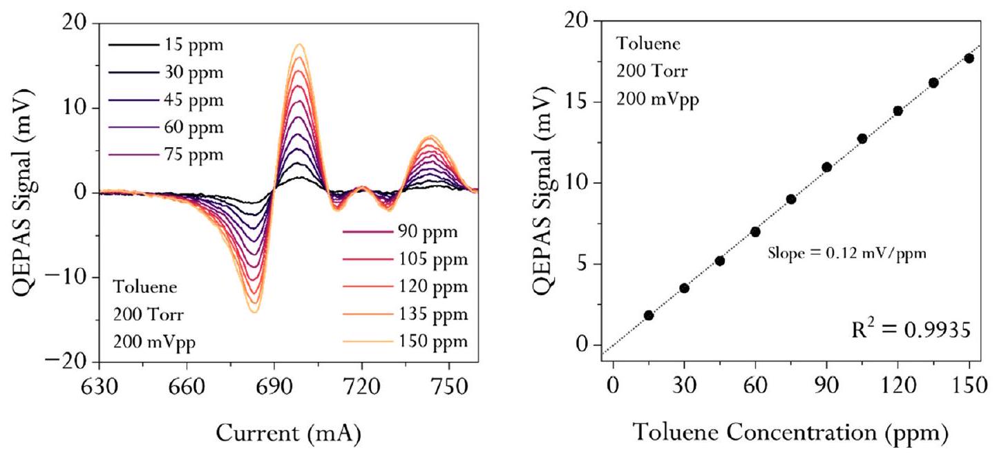 تم الكشف عن البنزين والبروبان، على التوالي. تم حساب مستوى الضوضاء (0.07 و 0.15 و 0.07 مللي فولت للتولوين والبنزين والبروبان، على التوالي) كمعيار انحراف ( ) استجابة المستشعر عندما لا يوجد امتصاص بصري، وعادة ما يتم تحقيق ذلك عن طريق تدفق النيتروجين النقي عبر خلية QEPAS.