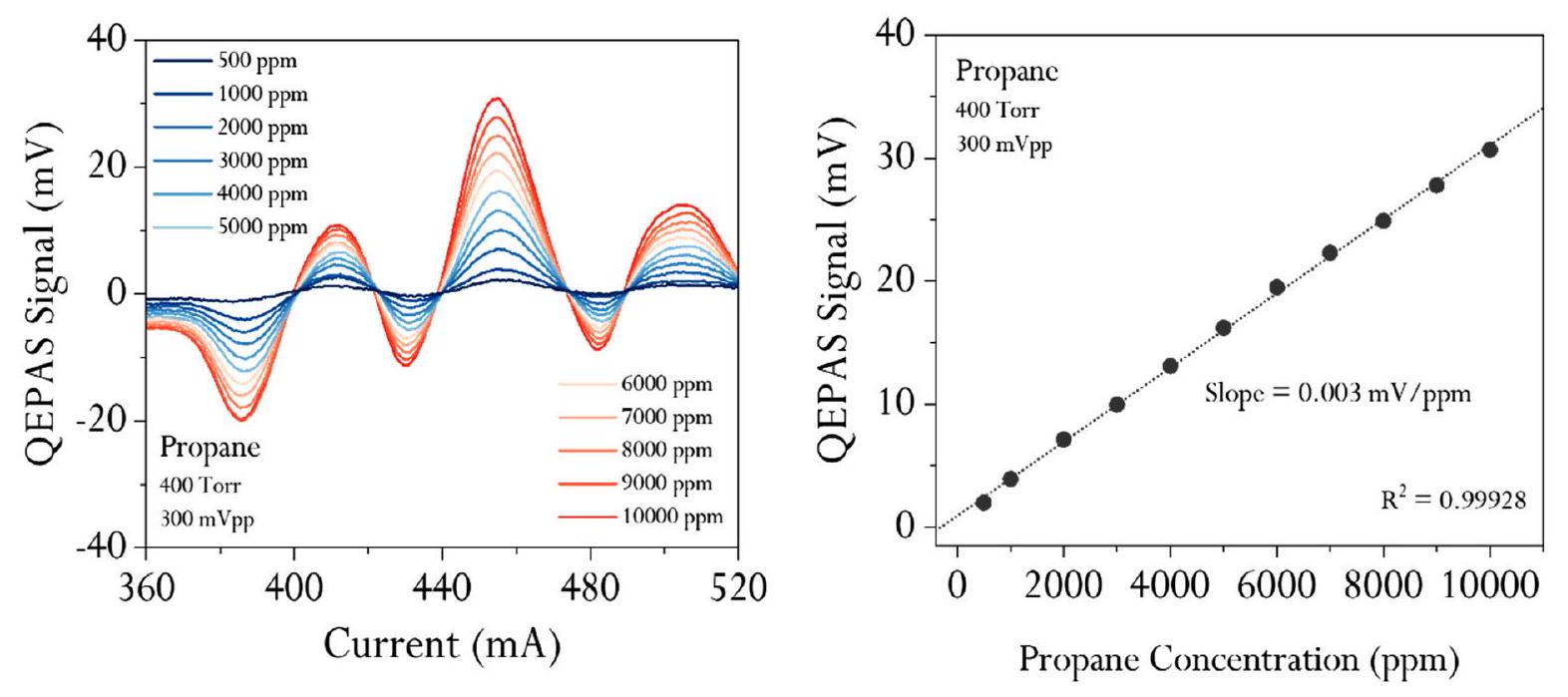 FIG. 10. (left) QEPAS spectra of propane obtained by sweeping the laser injection current within the QCLp tuning range at optimal working conditions, i.e., 300 mV peak-topeak laser current modulation amplitude and 400 Torr. (right) Peaks of most intense feature plotted against propane concentration (black circles). The slope and R-squared values of the linear fit (black dotted line) are reported.