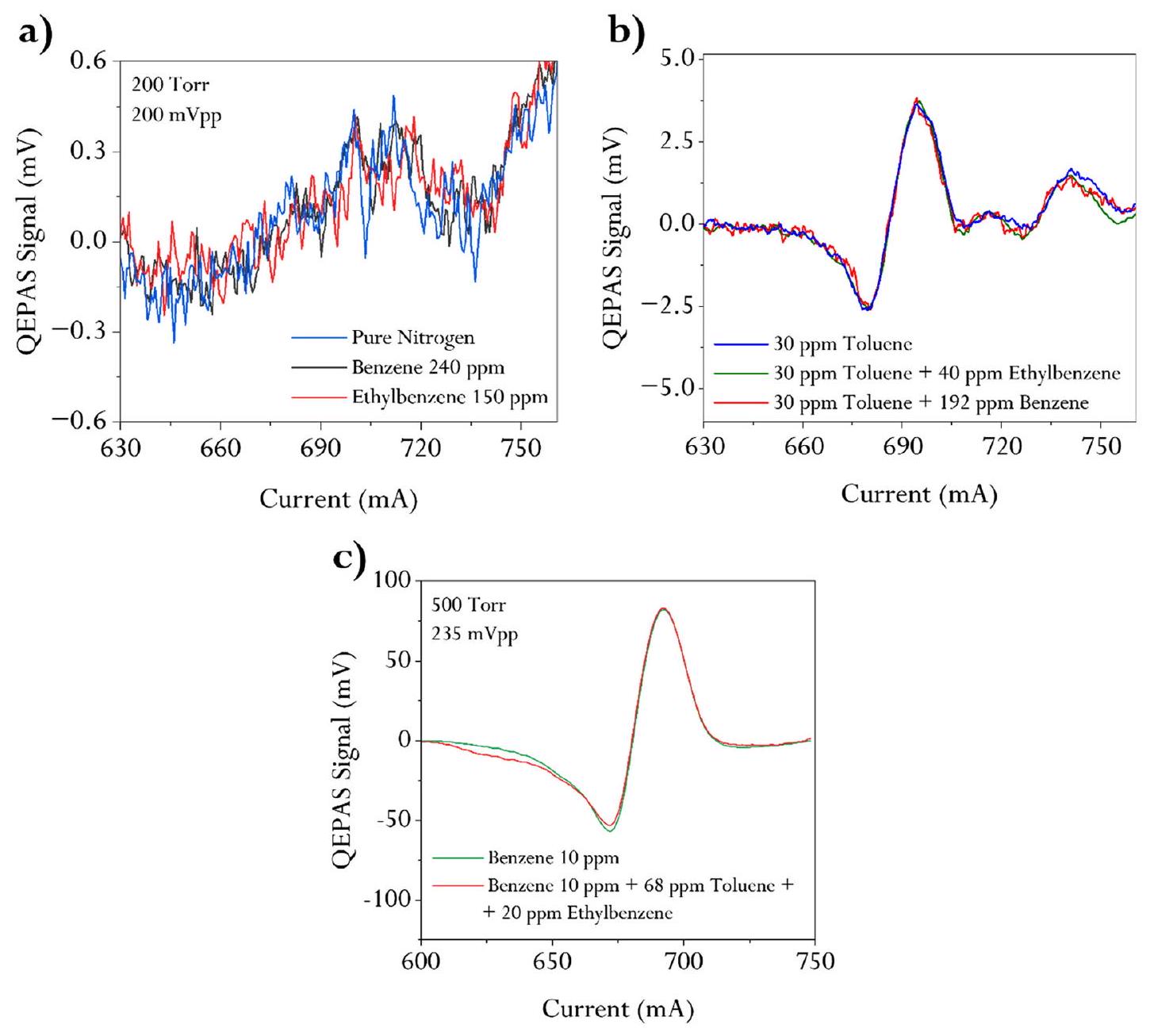 يوضح الشكل 12(أ) مقارنة لإشارة QEPAS التي تم الحصول عليها لـ 240 جزء في المليون من البنزين و150 جزء في المليون من الإيثيل بنزين والنيتروجين النقي، باستخدام الإعداد الموضح في الشكل 3 مع كمصدر للضوء. تؤكد النتيجة أن كل من البنزين والإيثيل بنزين ليس لهما ميزات امتصاص يمكن اكتشافها ضمن النطاق الديناميكي الحالي لـ . تم تأكيد ذلك من خلال تقييم الفرق نقطة بنقطة بين الطيفين الثلاثة، مما أدى إلى تقلبات أقل من تقلبات إشارة QEPAS عند أي قيمة تيار ثابتة. يمكن أن يُعزى الهيكل الطيفي الخلفي الضعيف المرئي في جميع الحالات الثلاث إلى