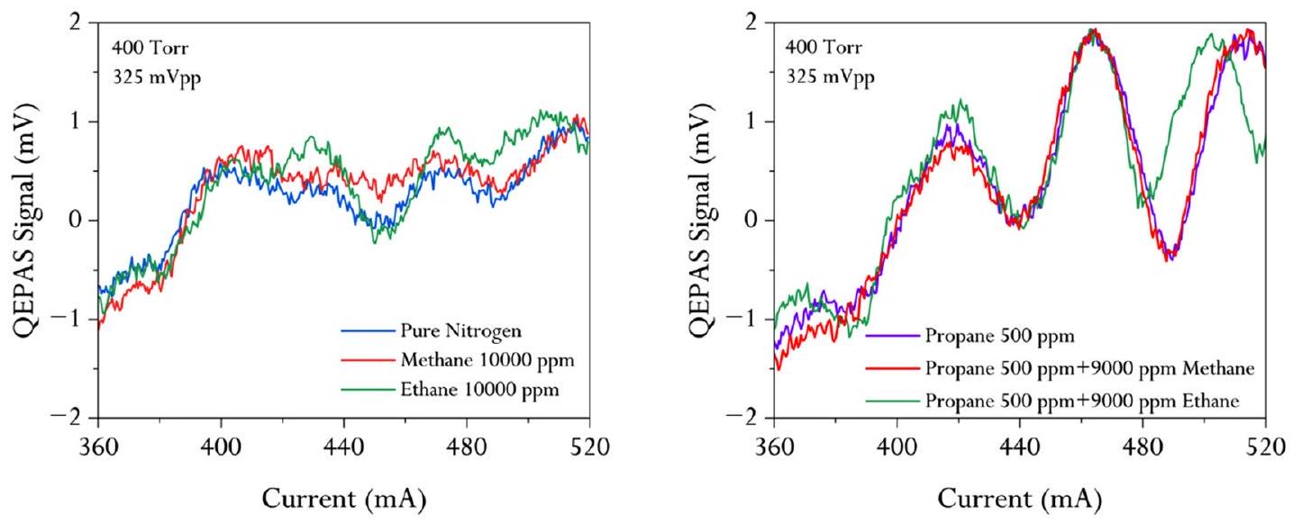 علاوة على ذلك، تقارن اللوحة اليمنى في الشكل 13 إشارات QEPAS التي تم الحصول عليها لـ 500 جزء في المليون من البروبان في مع مزيجين غازيين مختلفين. يتكون المزيج الأول من 500 جزء في المليون من البروبان مختلط مع 9000 جزء في المليون من الميثان في ، بينما يتكون المزيج الثاني من 500 جزء في المليون من البروبان مختلط مع 9000 جزء في المليون من الإيثان في . من