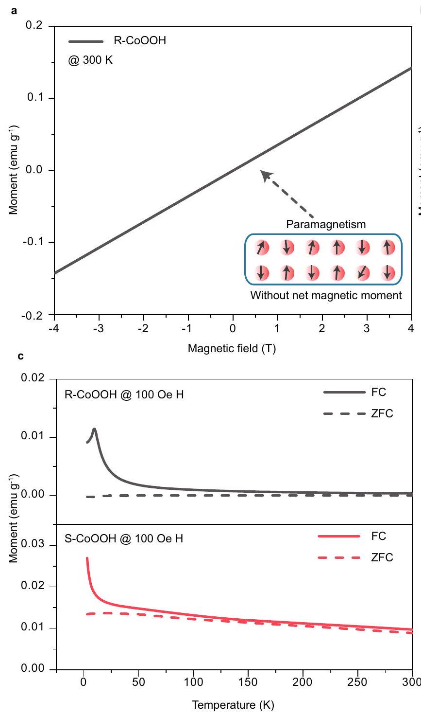 external magnetic field is reduced to zero (Fig. 2b). These features signify that S-CoOOH exhibits ferromagnetic behavior at 300 K with unpaired electrons. Further analysis of the temperature-dependent magnetization (M-T) curves for R-CoOOH (Fig. 2c) reveals an inflection point around 10 K , referred to as the Néel temperature, suggesting a transition from a paramagnetic to an antiferromagnetic state. Considering that 3 K is below the Néel temperature, it confirms antiferromagnetic behavior of R-CoOOH at 3 K (Supplementary Fig. S6), where all electrons are paired up and adjacent valence electrons have opposite spin directions. The non-linear antiferromagnetic character in the